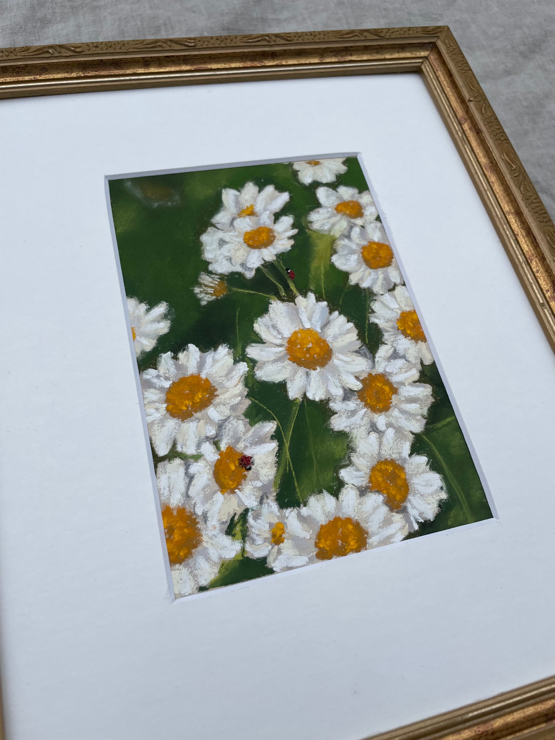 Option to mat artwork in white beveled custom matt-board ready for a 8x10 frame. Frame is NOT included. Pastels need to be handled with care. Paintings are sealed with fixative but are still to be handled with care. It is recommended to frame behind glass.