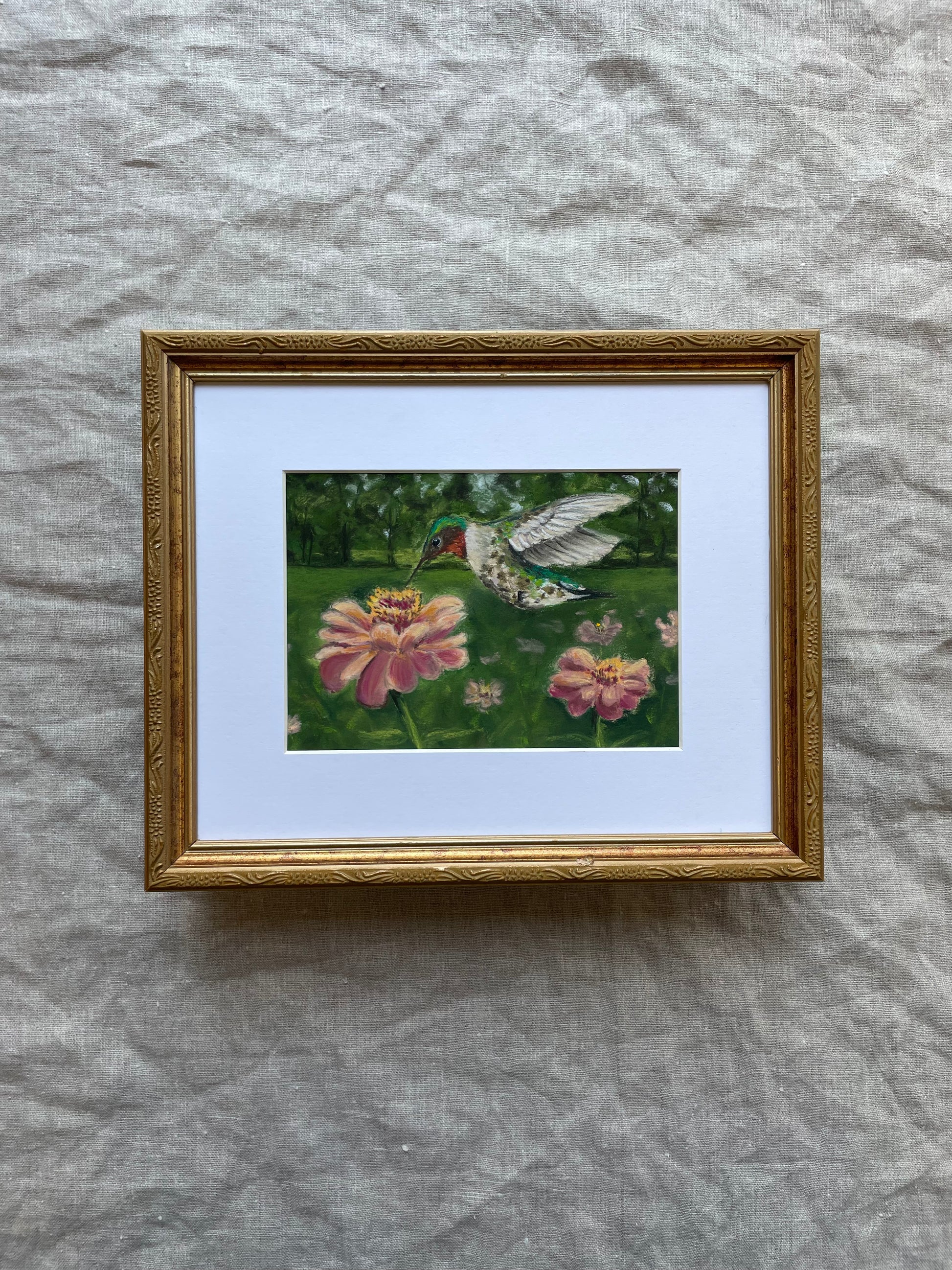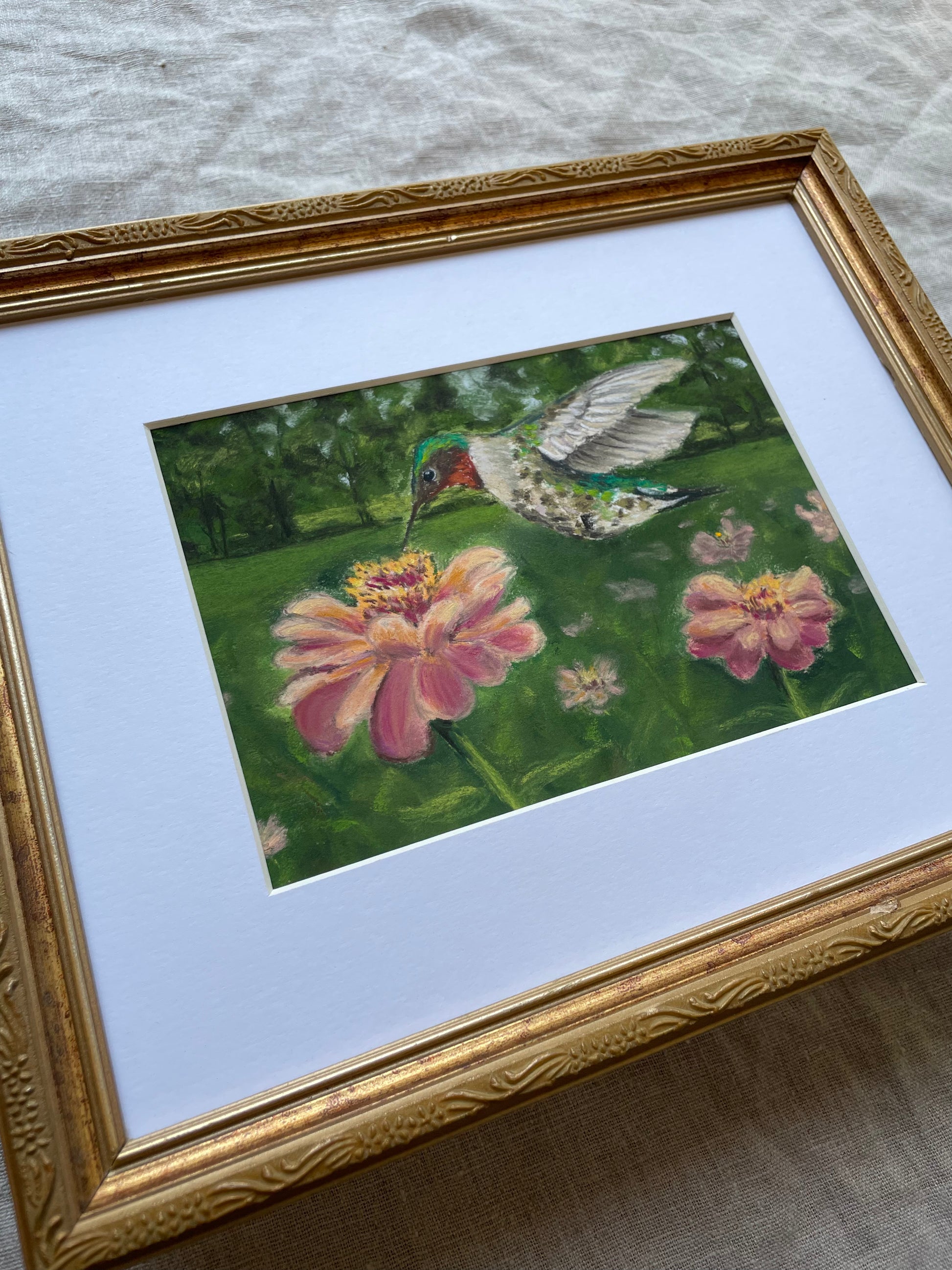 Artwork is matted in white beveled custom matt-board ready for a 8x10 frame. Frame is NOT included. Pastels need to be handled with care. Paintings are sealed with fixative but are still to be handled with care. It is recommended to frame behind glass.