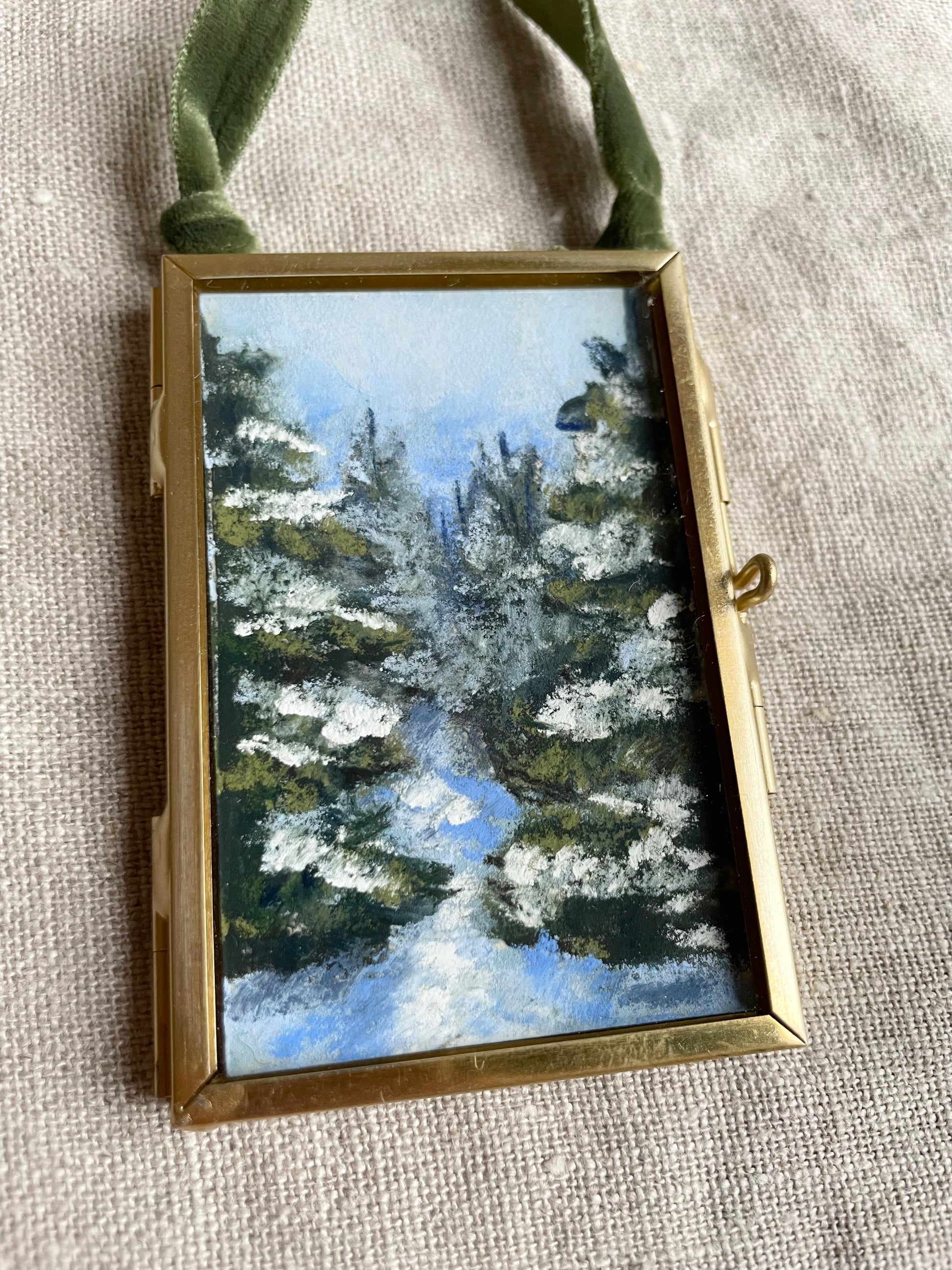 2 x 3 inches. Hanging brass framed ornament with velvet ribbon for hanging. Signed and titled on reverse. Ornament comes carefully wrapped and tied with ribbon ready for gifting.