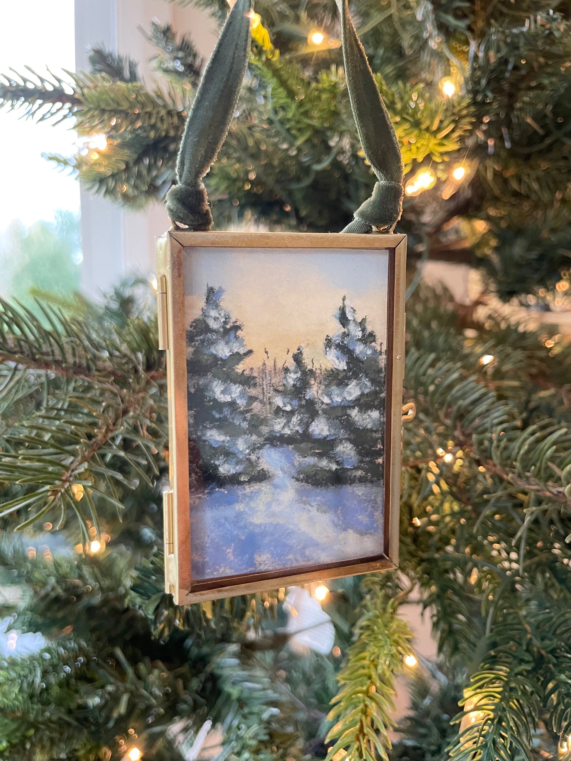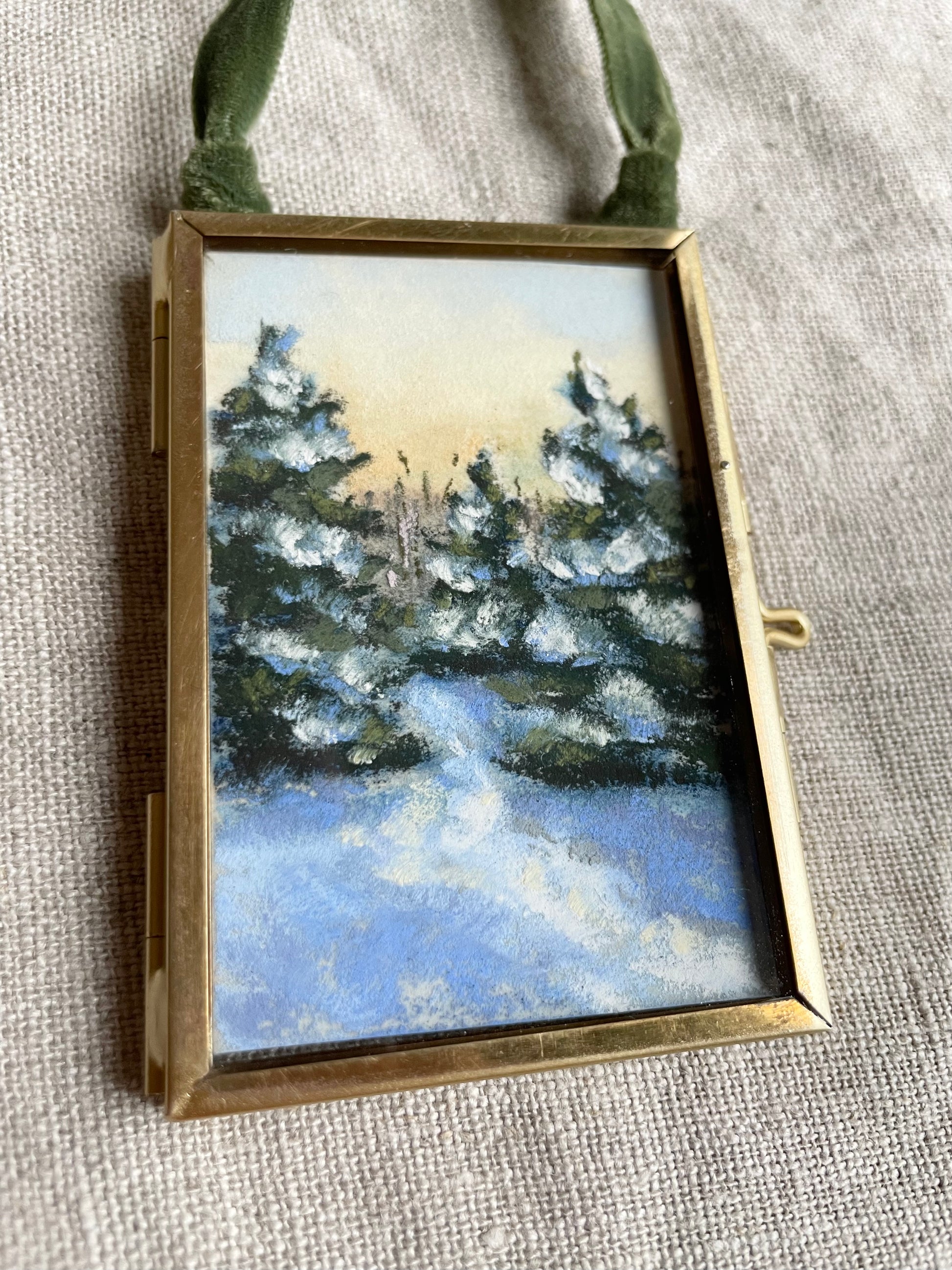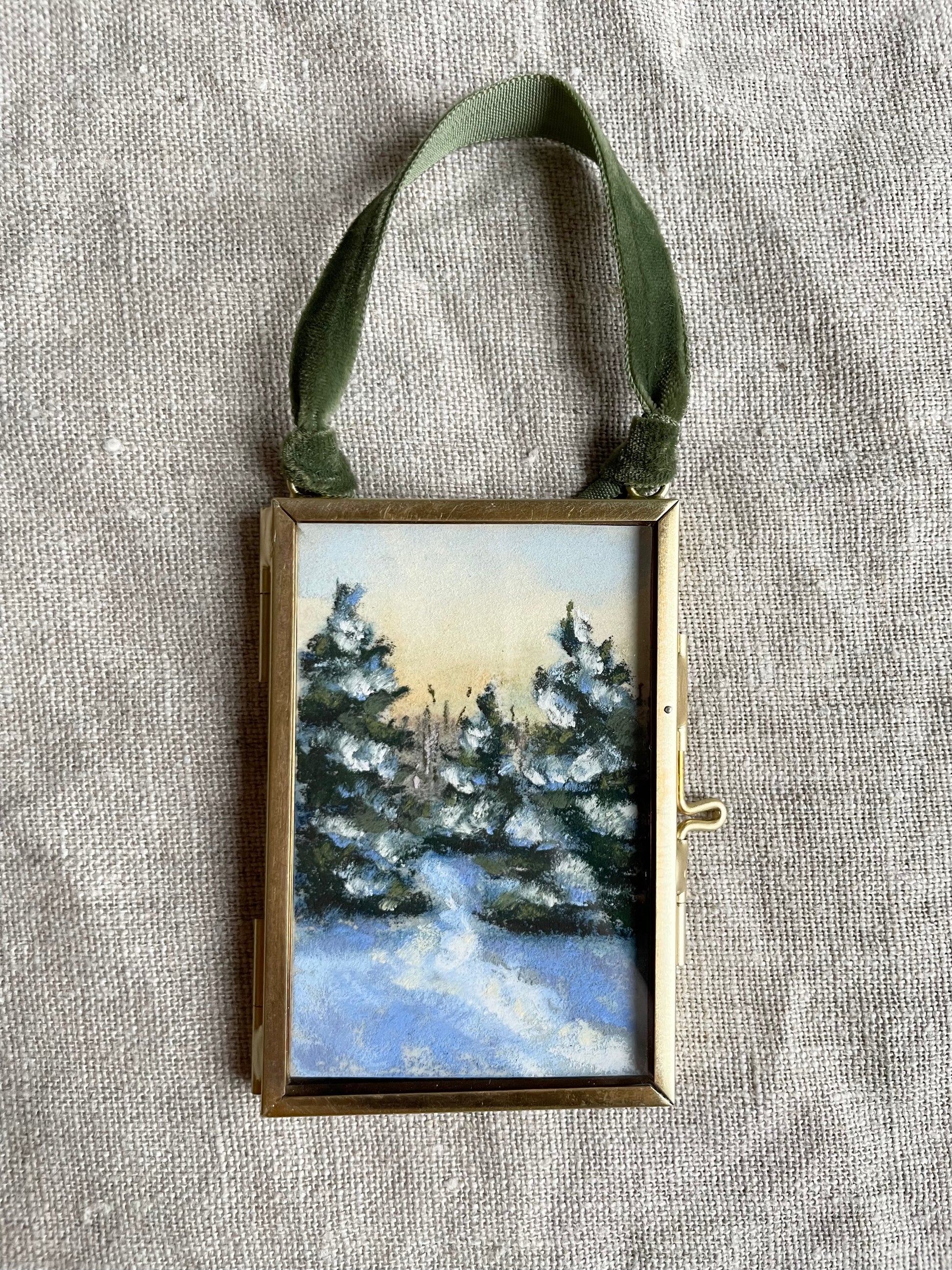 2 x 3 inches. Hanging brass framed ornament with velvet ribbon for hanging. Signed and titled on reverse. Ornament comes carefully wrapped and tied with ribbon ready for gifting.