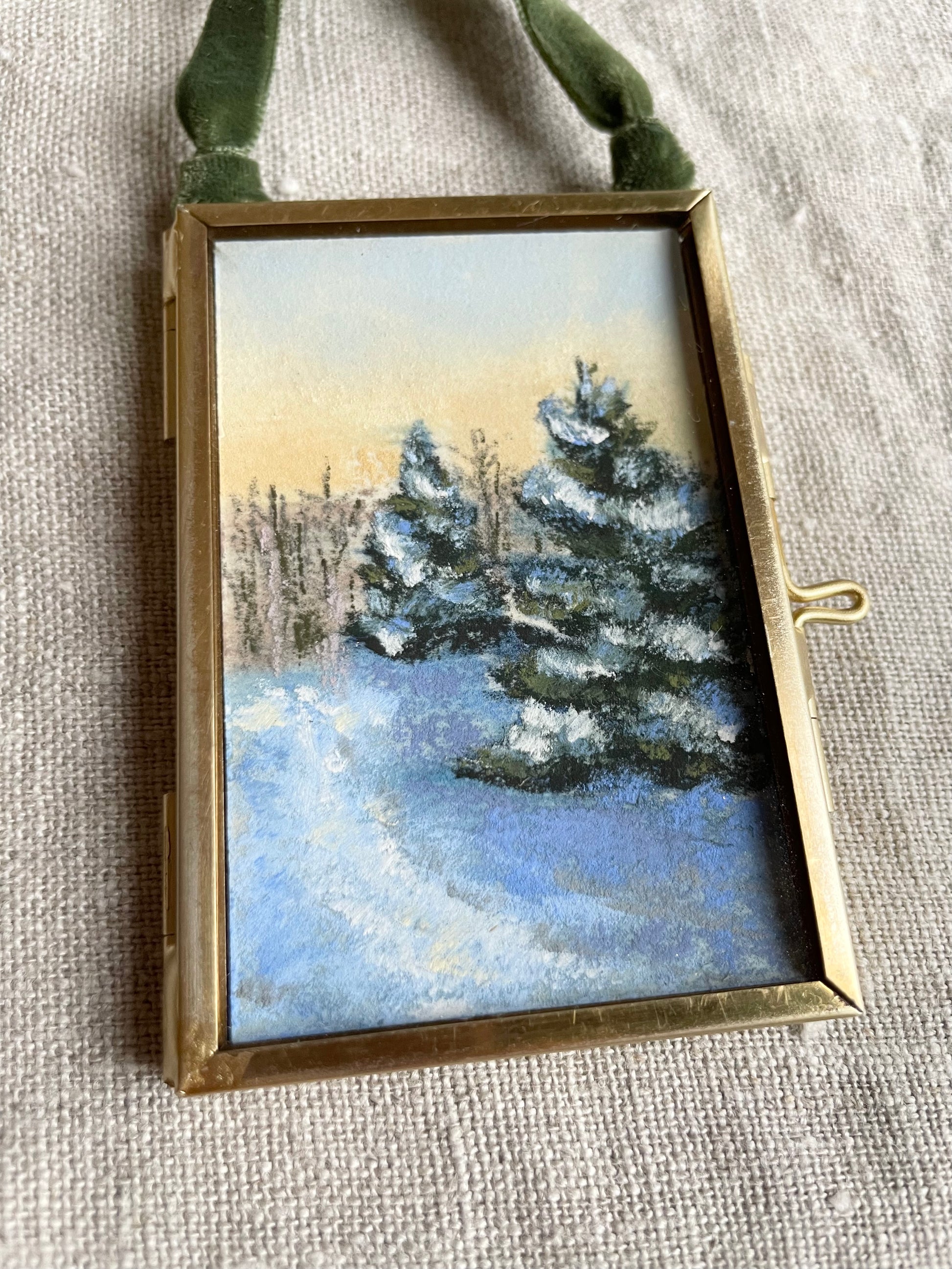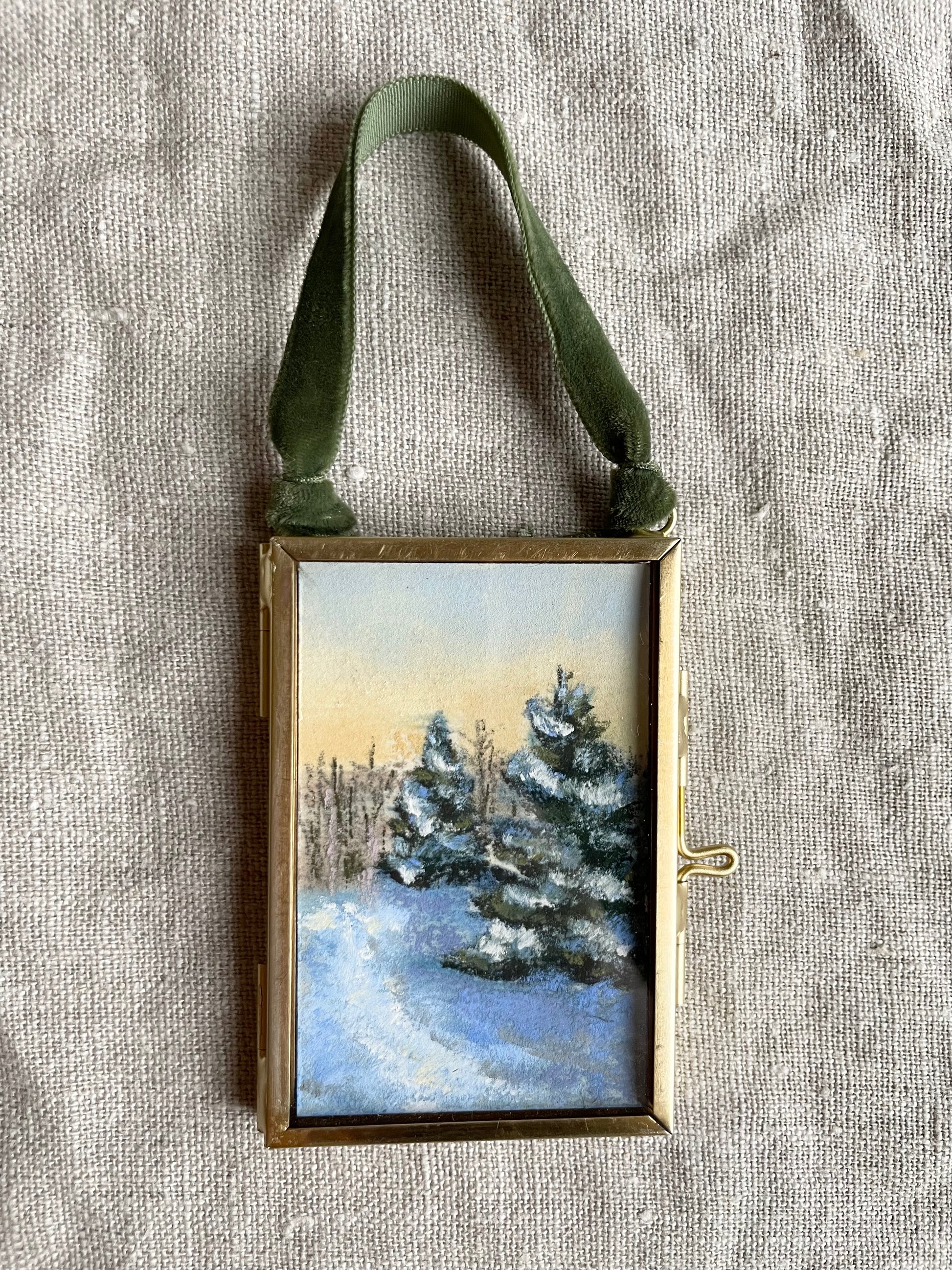 2 x 3 inches. Hanging brass framed ornament with velvet ribbon for hanging. Signed and titled on reverse. Ornament comes carefully wrapped and tied with ribbon ready for gifting.