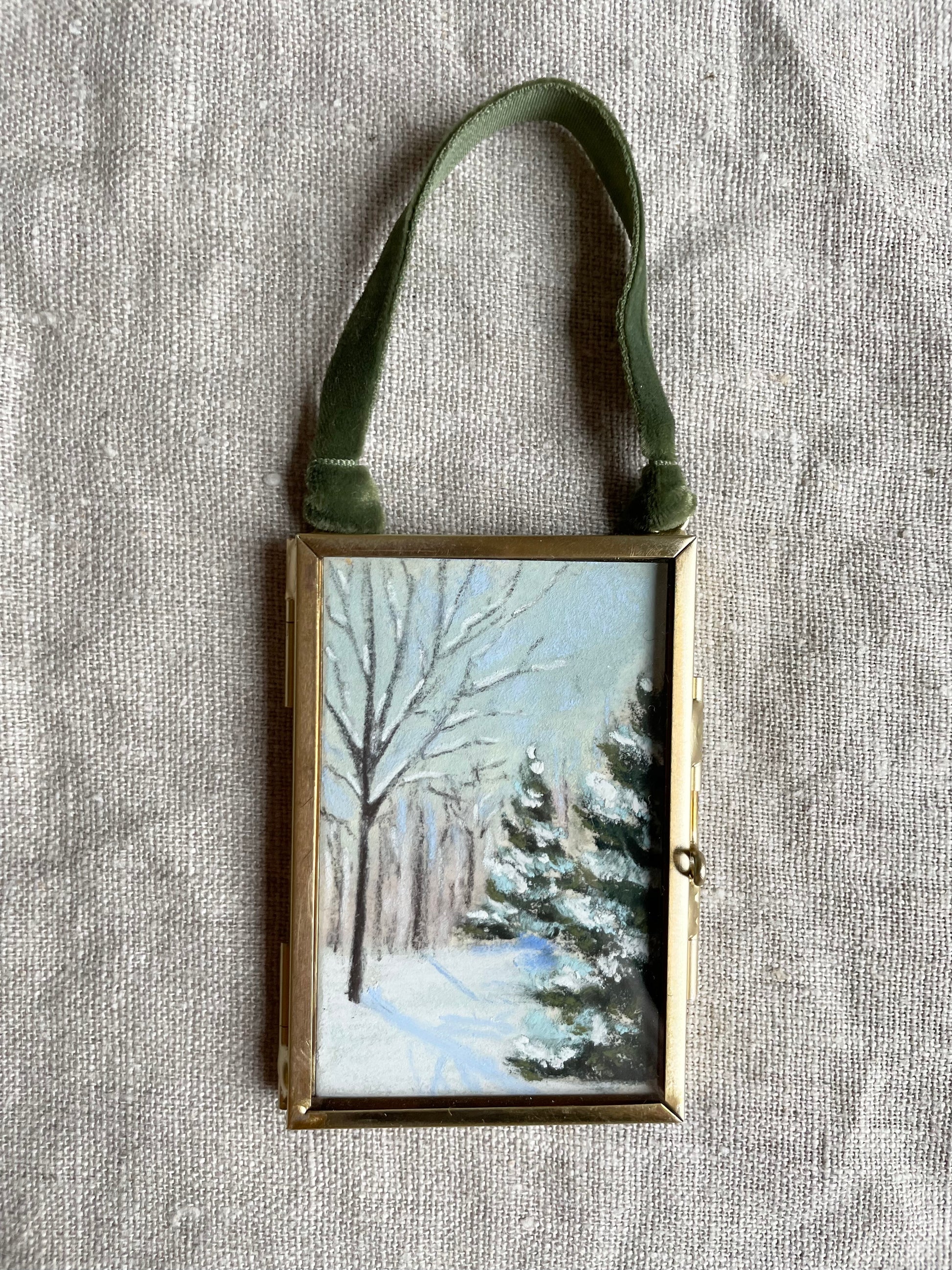 2 x 3 inches. Hanging brass framed ornament with velvet ribbon for hanging. Signed and titled on reverse. Ornament comes carefully wrapped and tied with ribbon ready for gifting.