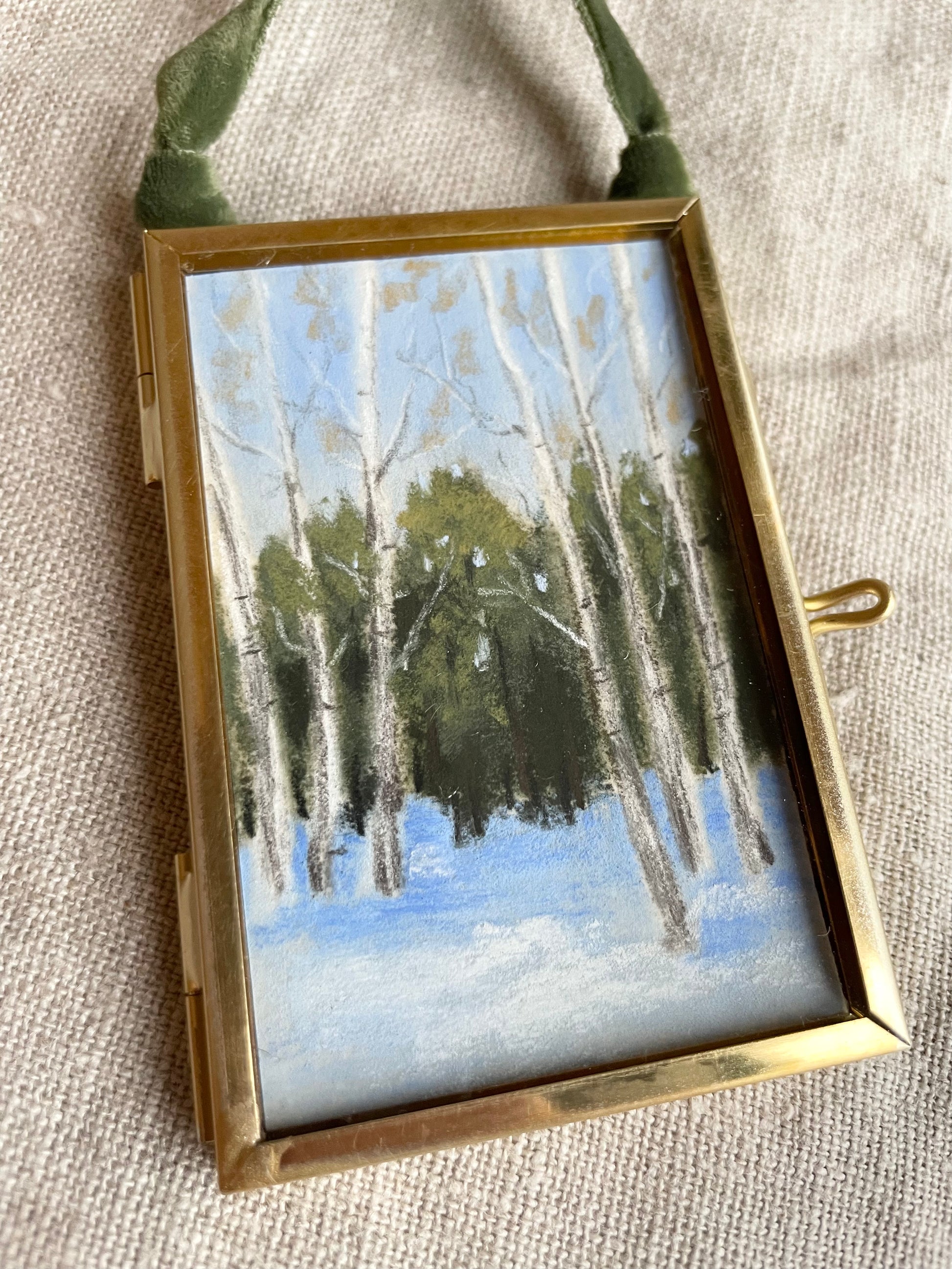 2 x 3 inches. Hanging brass framed ornament with velvet ribbon for hanging. Signed and titled on reverse. Ornament comes carefully wrapped and tied with ribbon ready for gifting.