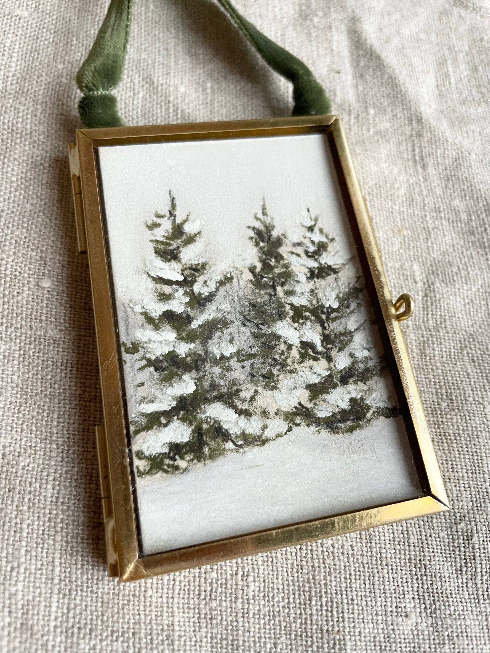 2 x 3 inches. Hanging brass framed ornament with velvet ribbon for hanging. Signed and titled on reverse. Ornament comes carefully wrapped and tied with ribbon ready for gifting.
