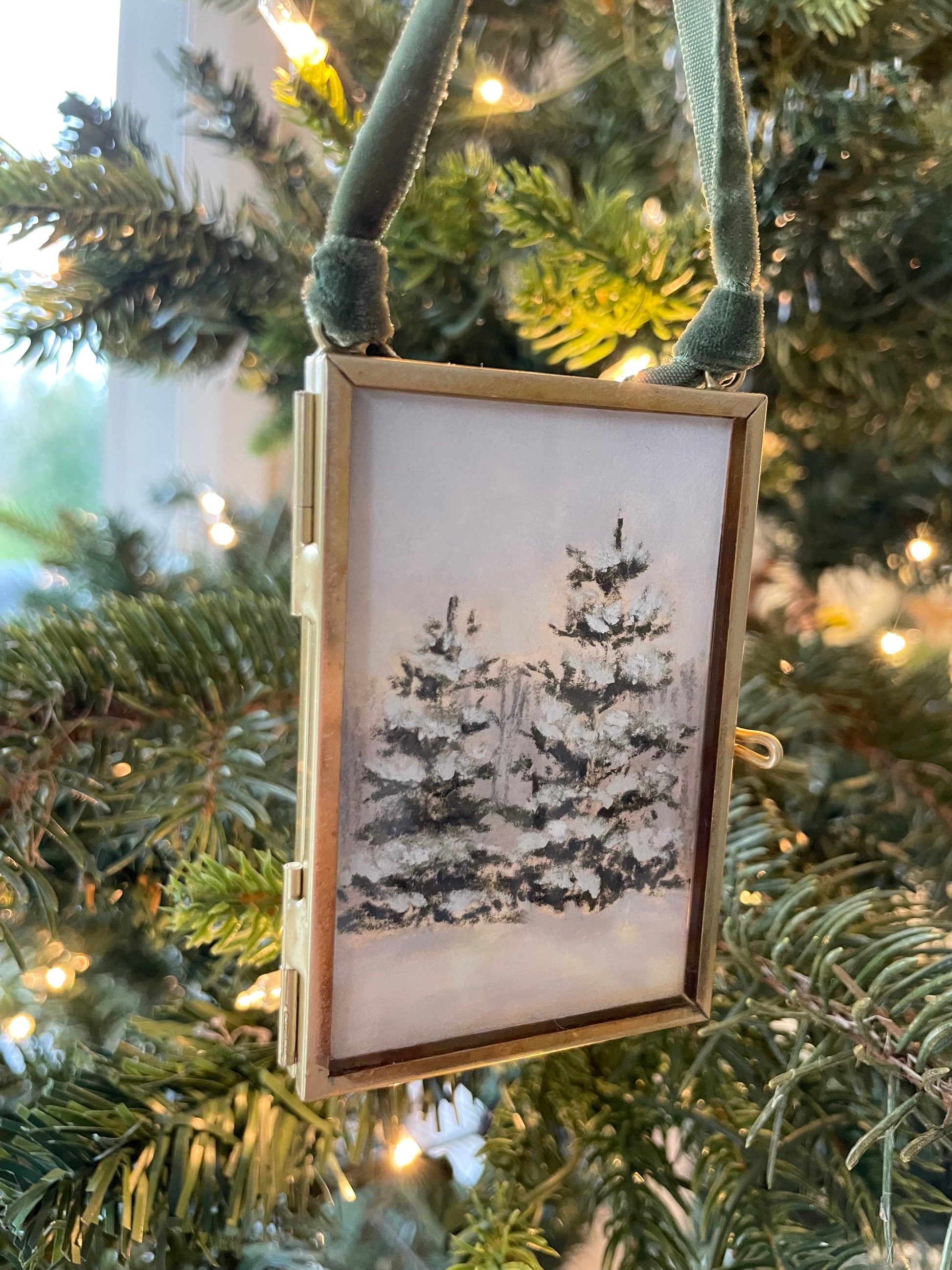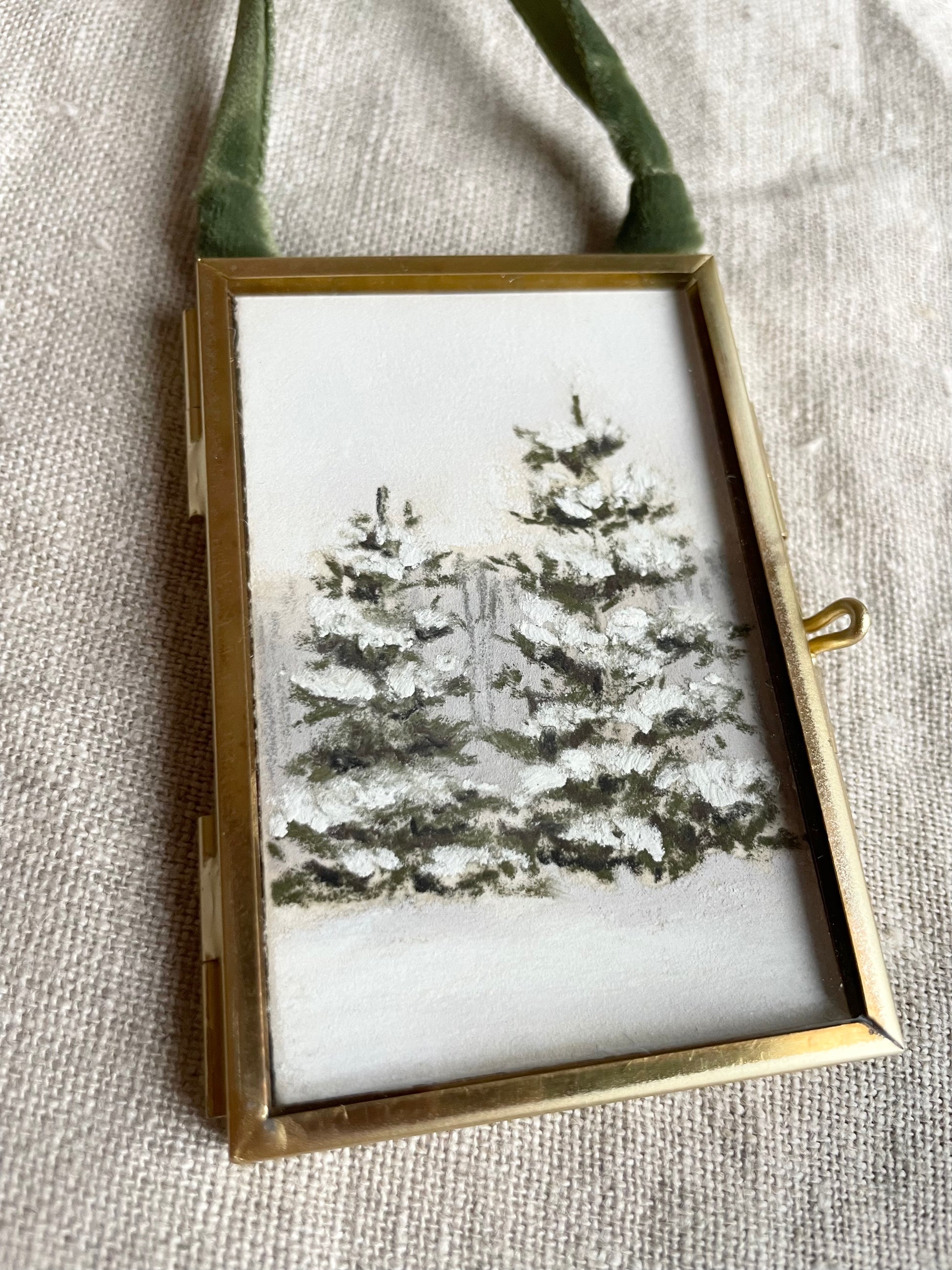 2 x 3 inches. Hanging brass framed ornament with velvet ribbon for hanging. Signed and titled on reverse. Ornament comes carefully wrapped and tied with ribbon ready for gifting.