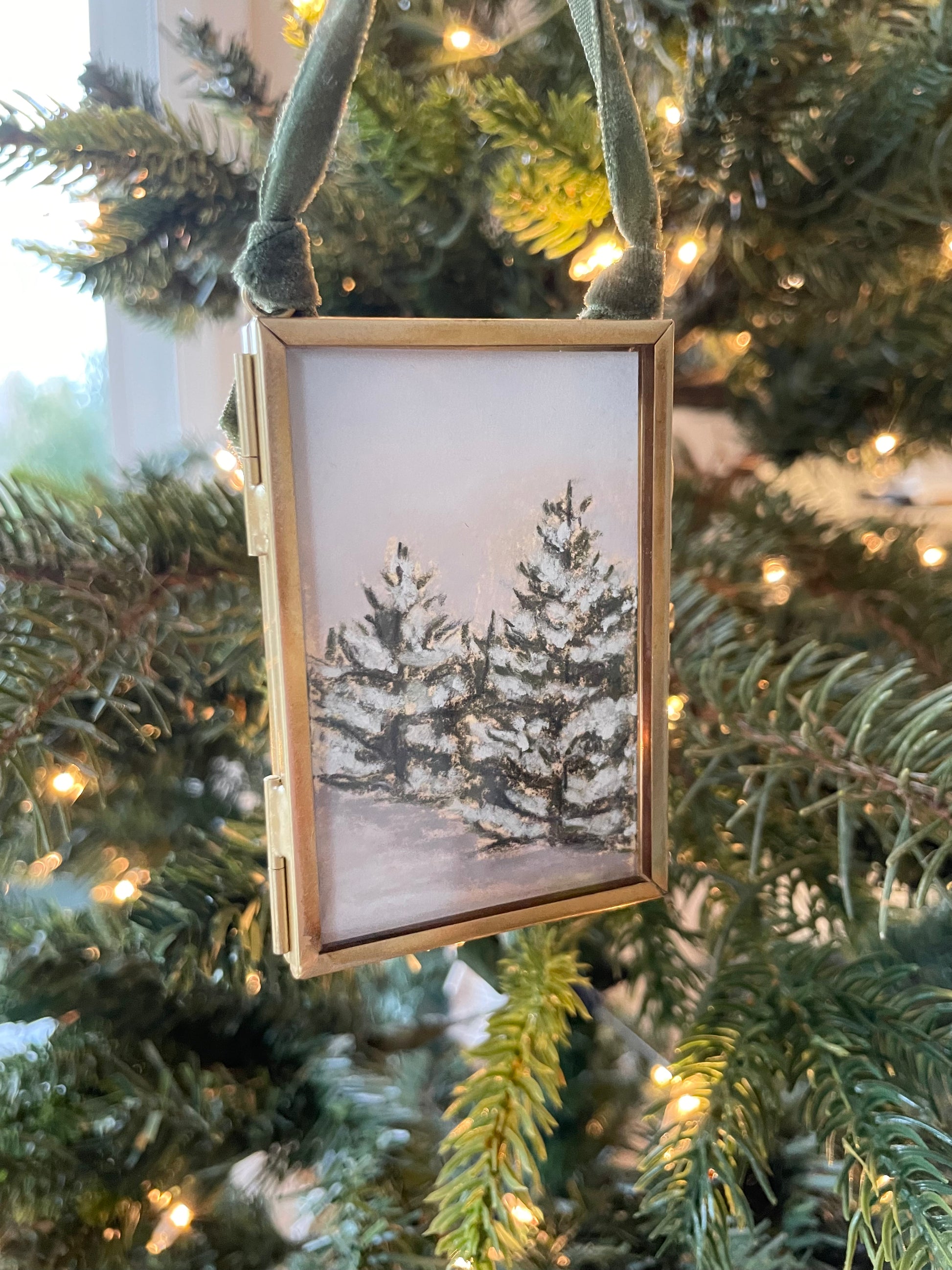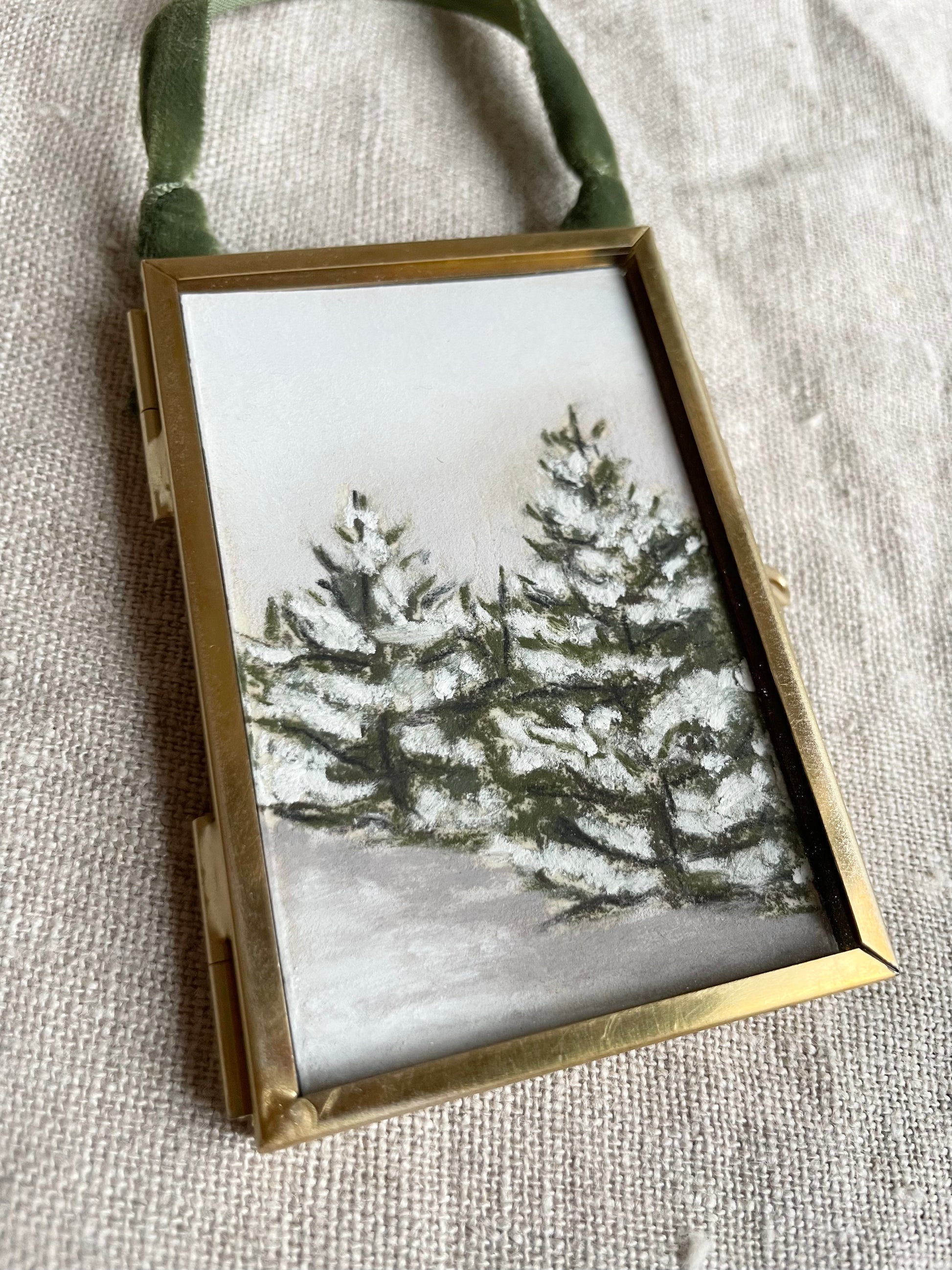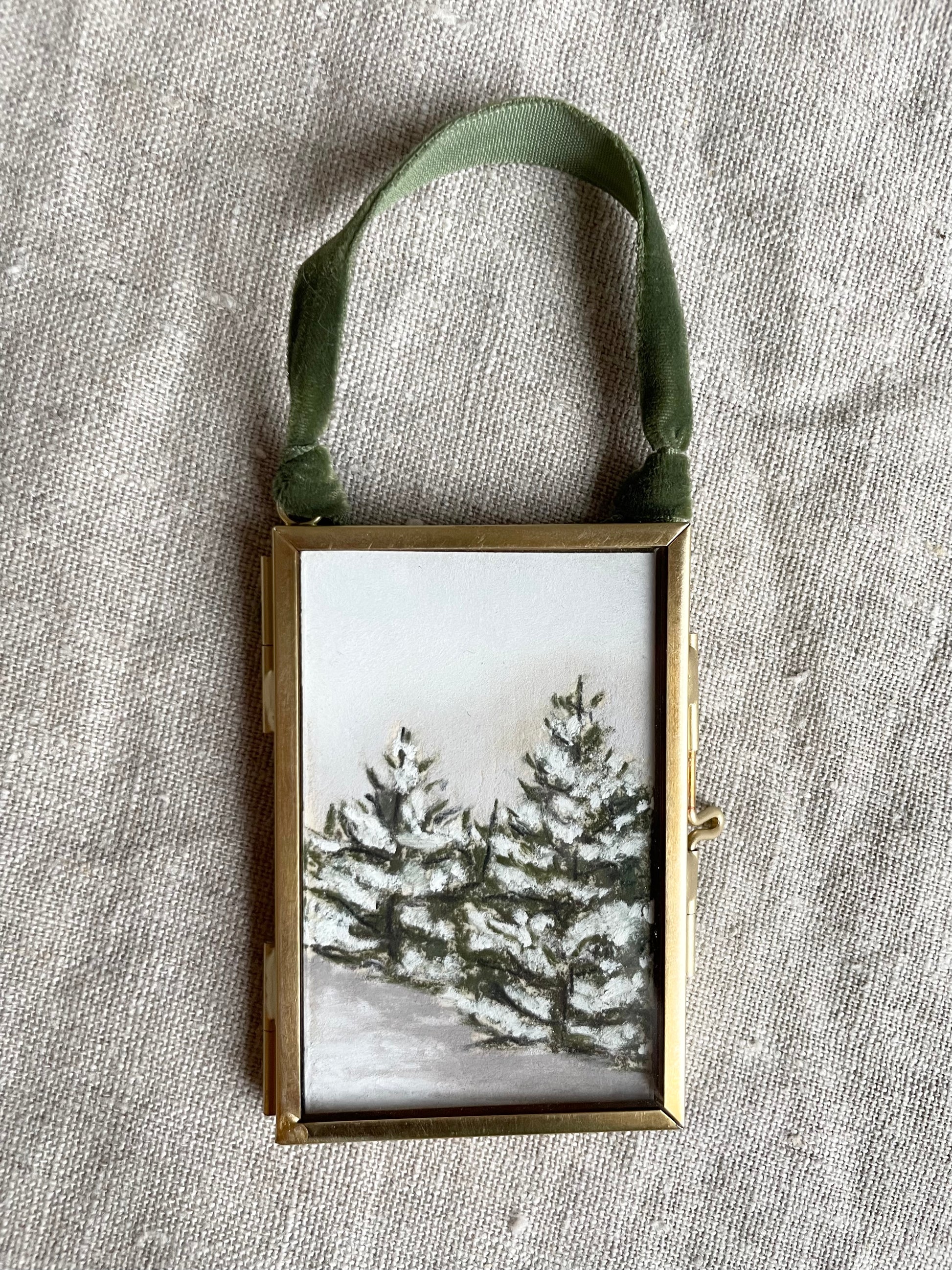 2 x 3 inches. Hanging brass framed ornament with velvet ribbon for hanging. Signed and titled on reverse. Ornament comes carefully wrapped and tied with ribbon ready for gifting.