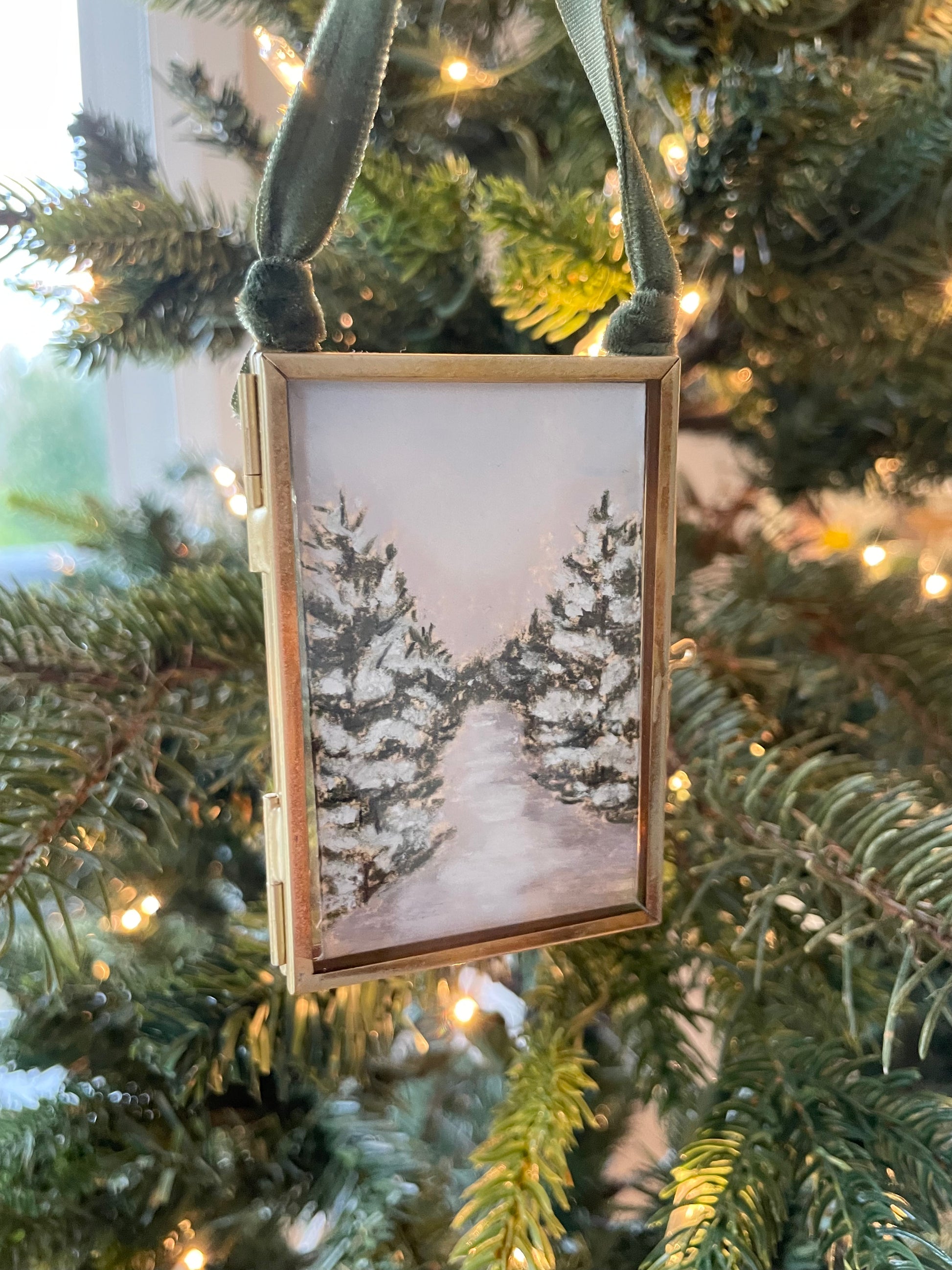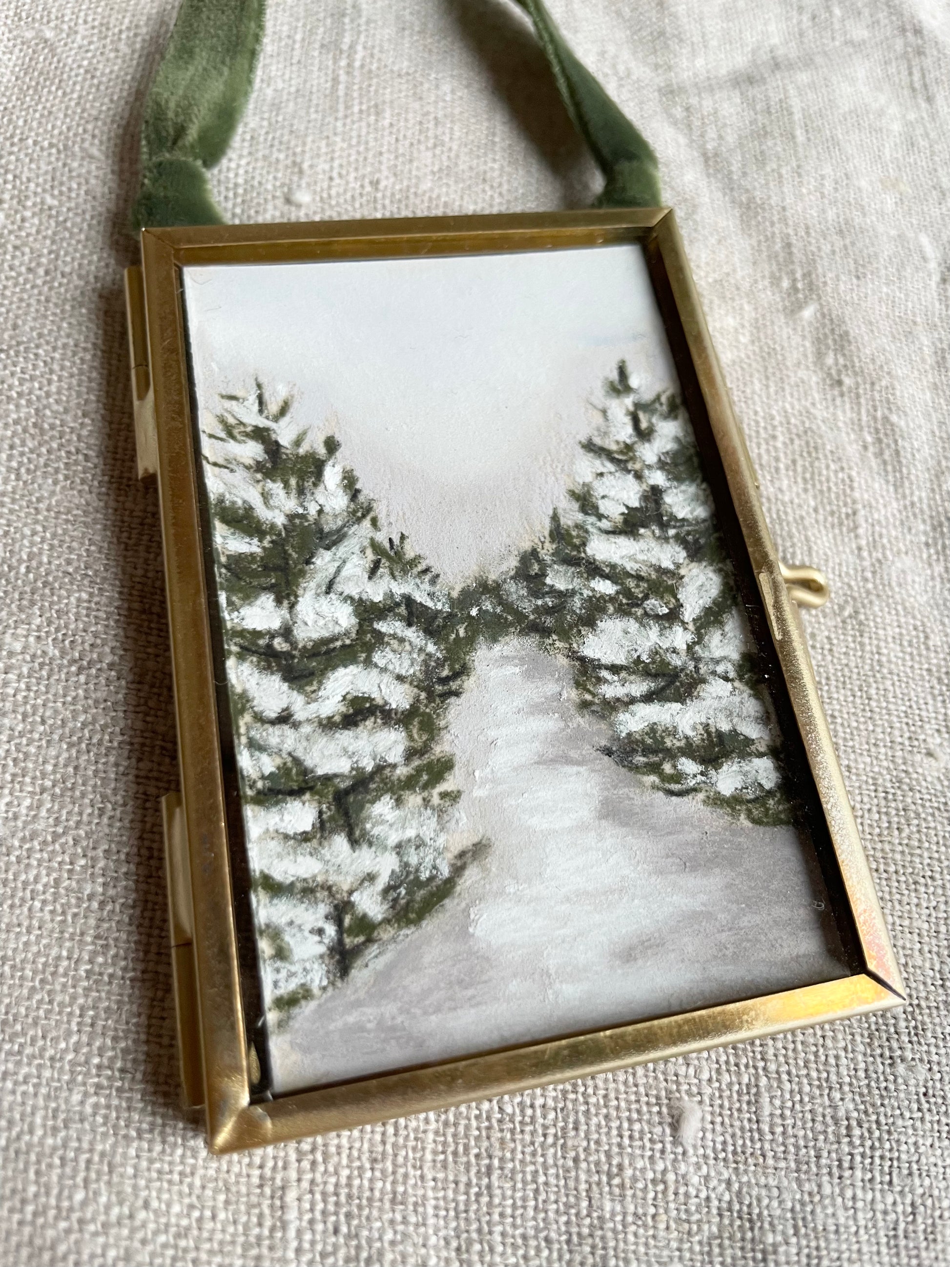 2 x 3 inches. Hanging brass framed ornament with velvet ribbon for hanging. Signed and titled on reverse. Ornament comes carefully wrapped and tied with ribbon ready for gifting.