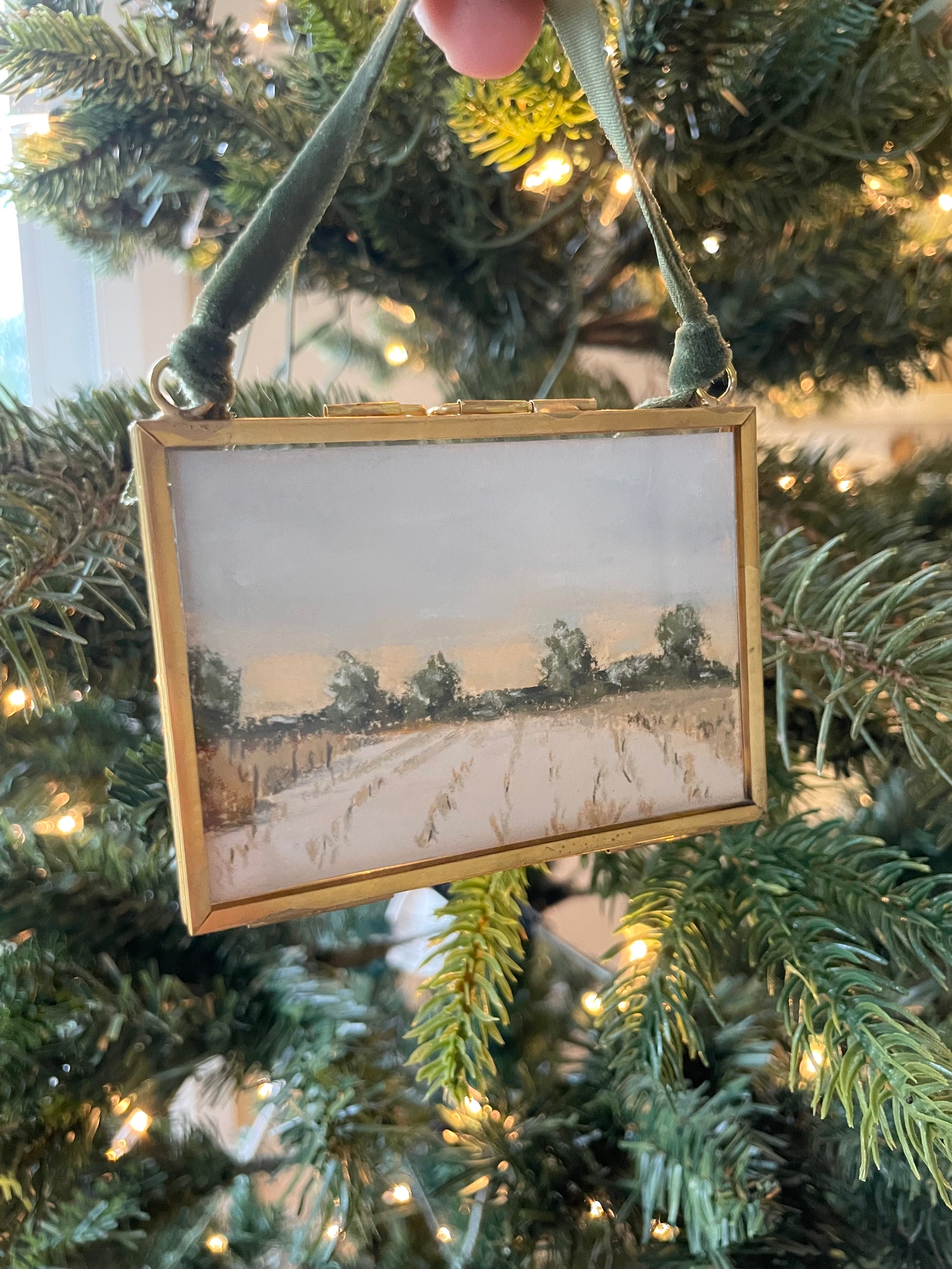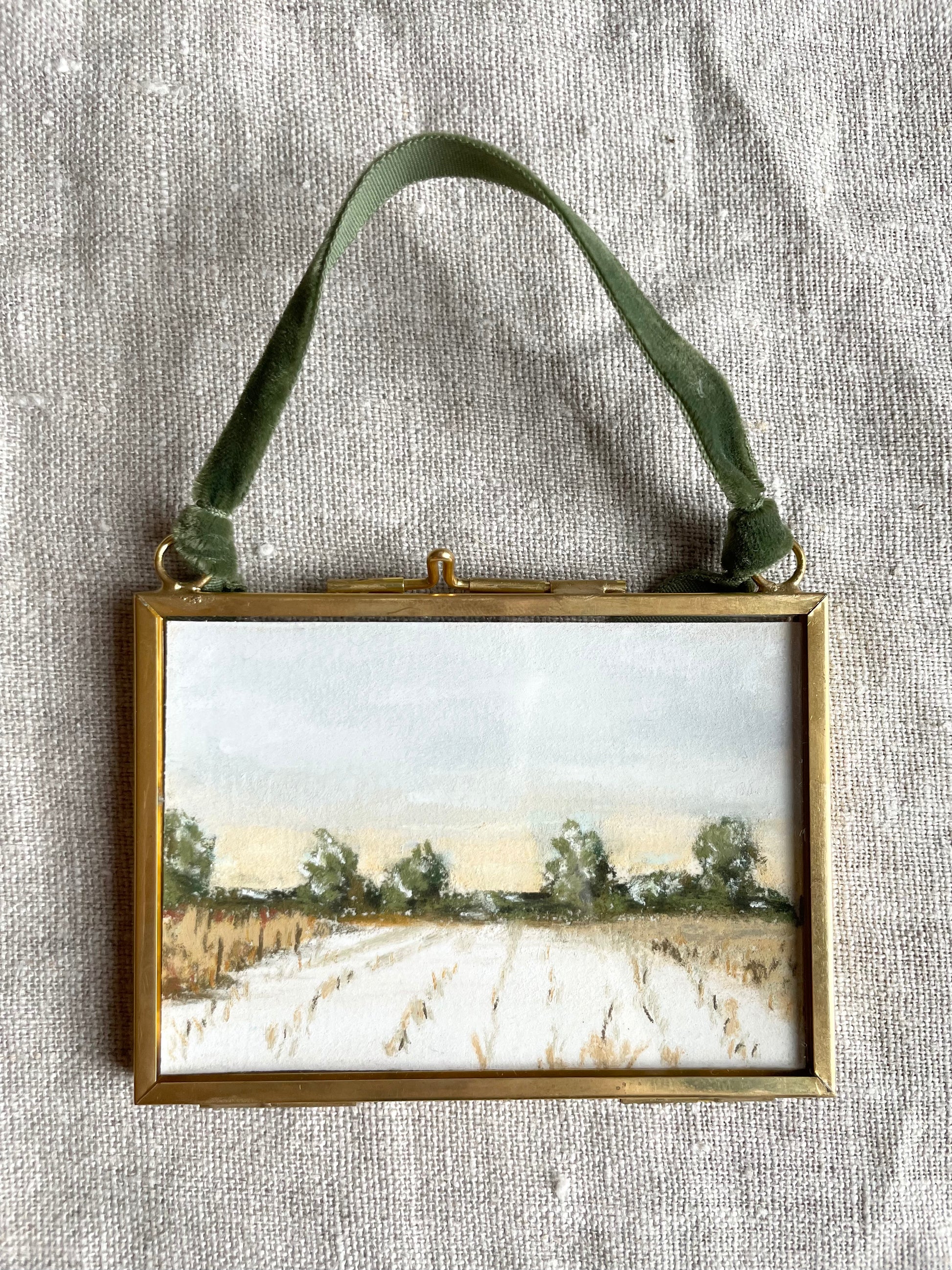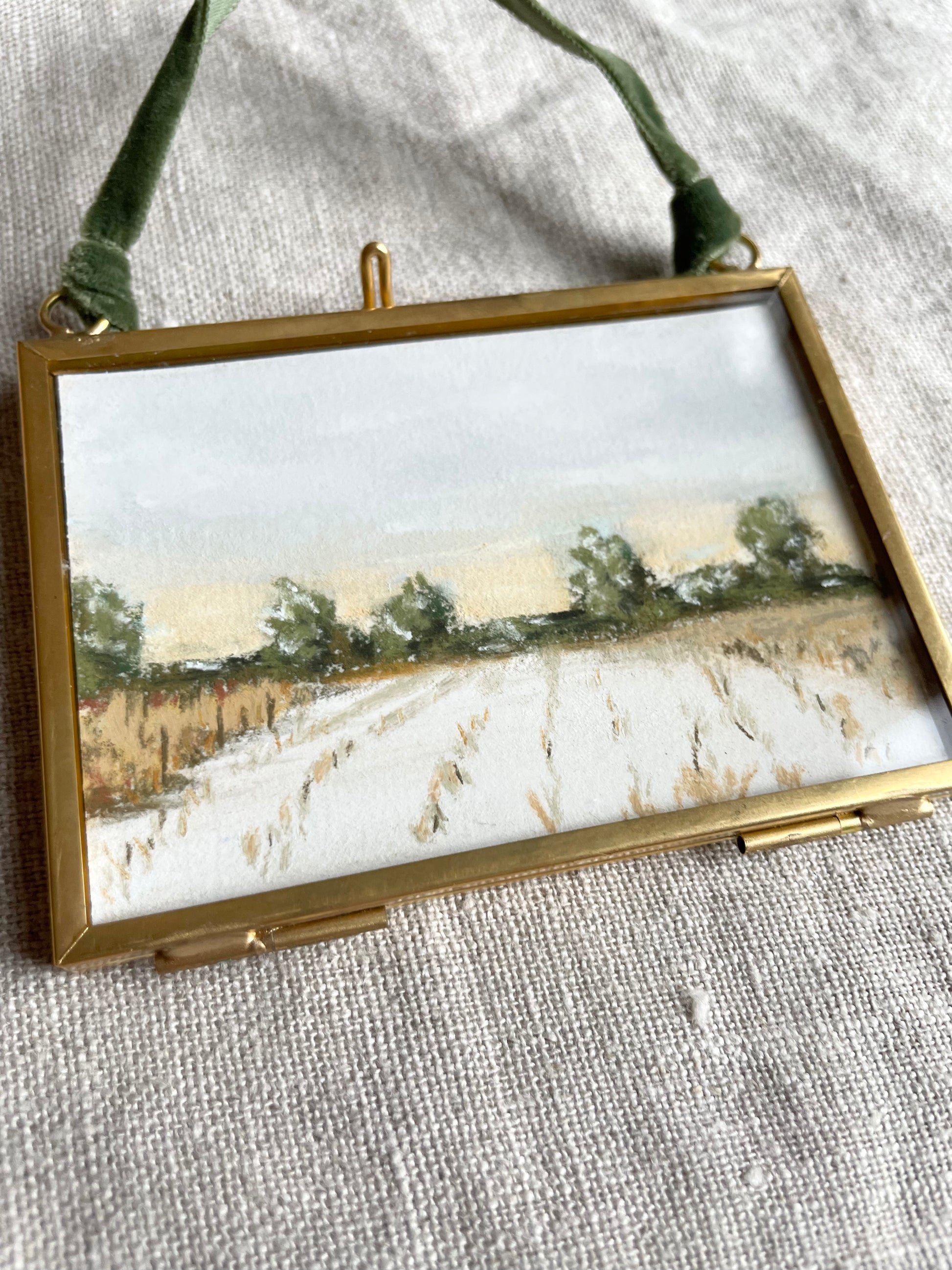 2.5 x 3.5 inches. Hanging brass framed ornament with velvet ribbon for hanging. Signed and titled on reverse. Ornament comes carefully wrapped and tied with ribbon ready for gifting.