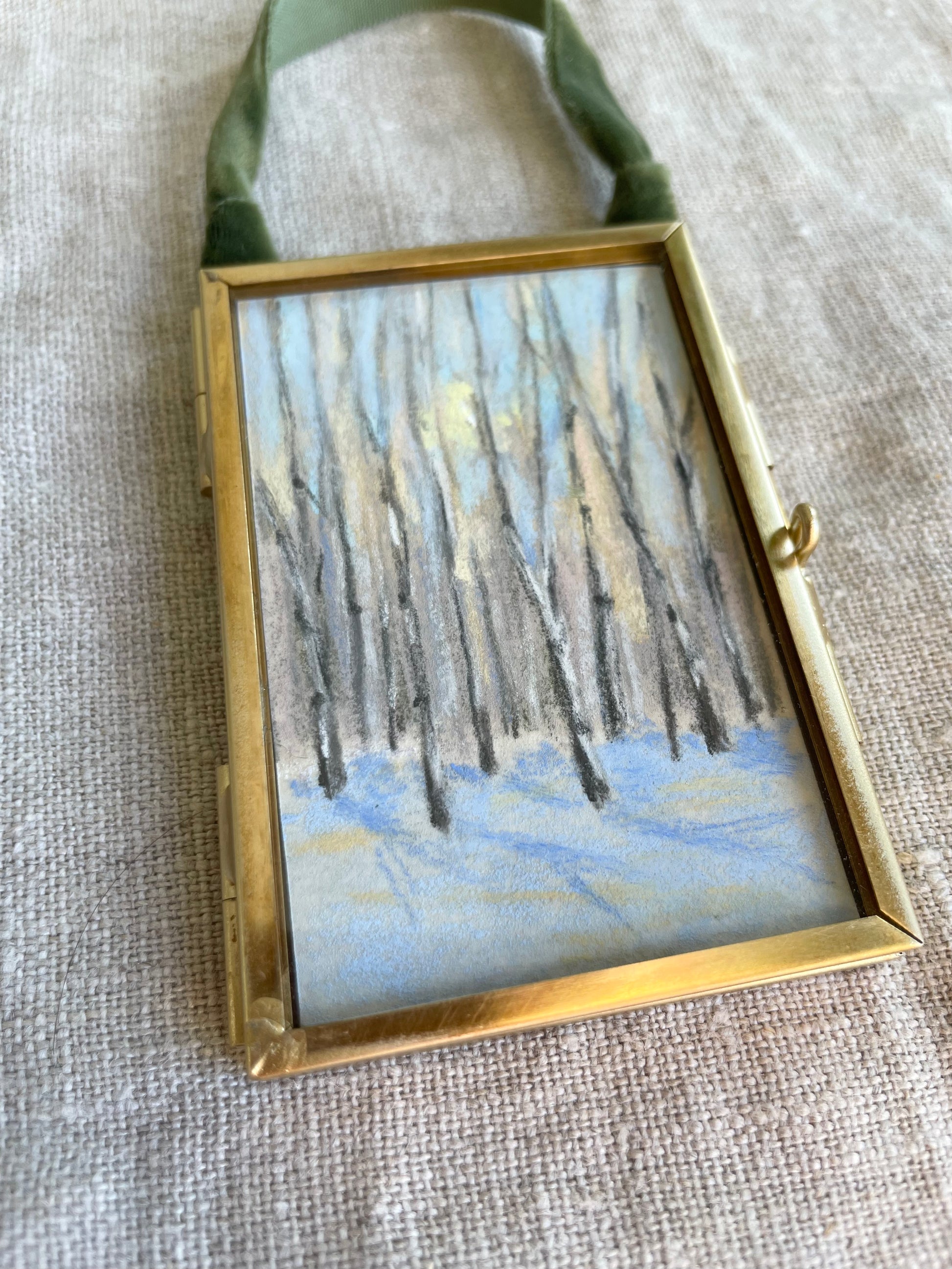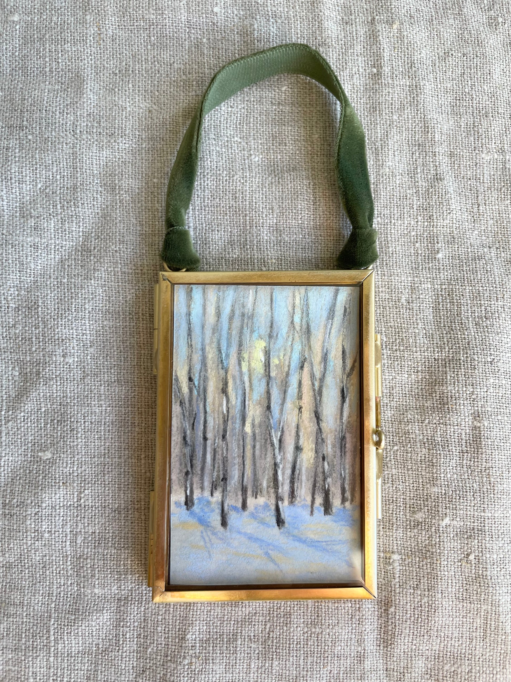 2 x 3 inches. Hanging brass framed ornament with velvet ribbon for hanging. Signed and titled on reverse. Ornament comes carefully wrapped and tied with ribbon ready for gifting.