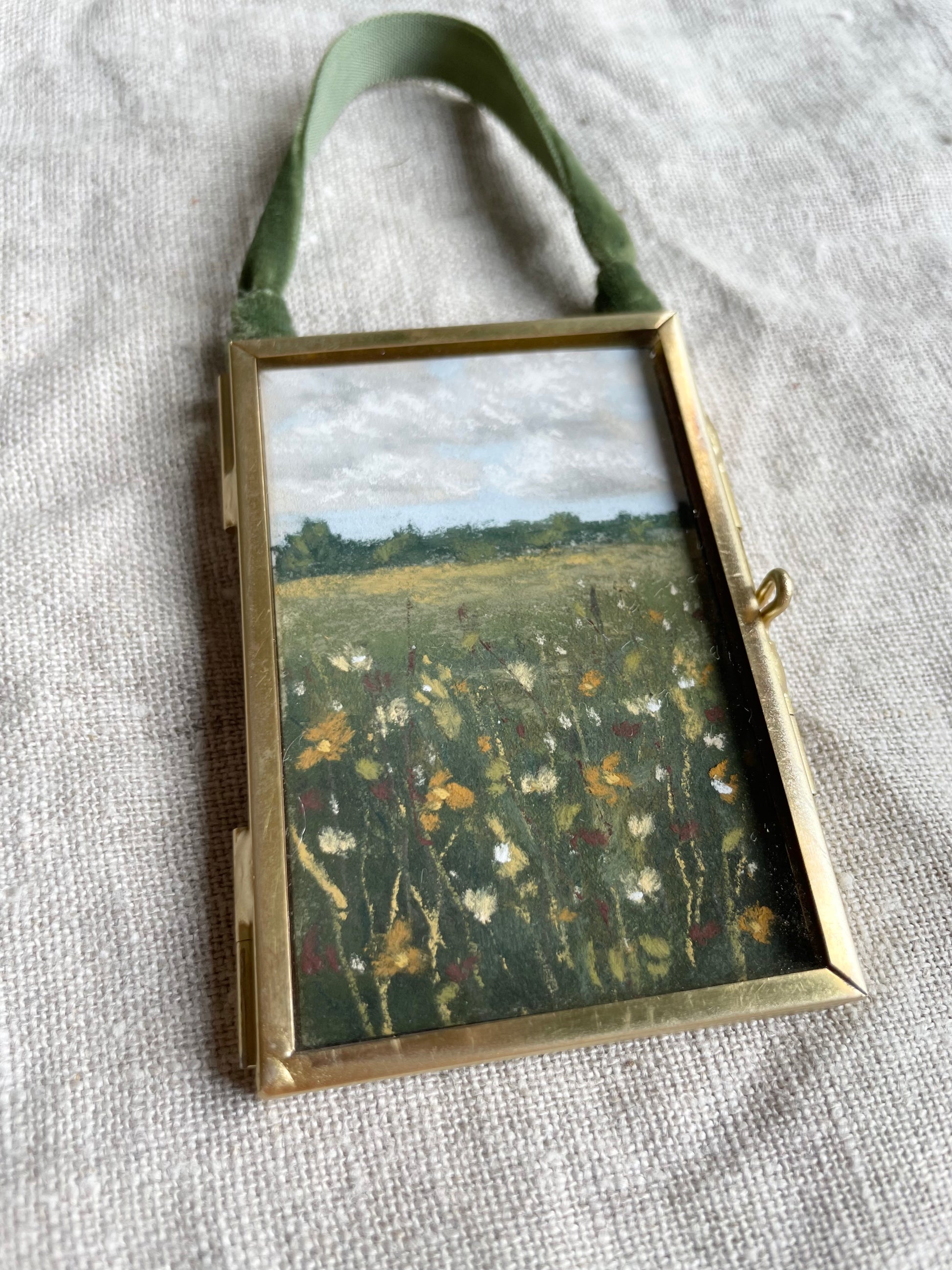 2 x 3 inches. Hanging brass framed ornament with velvet ribbon for hanging. Signed and titled on reverse. Ornament comes carefully wrapped and tied with ribbon ready for gifting.