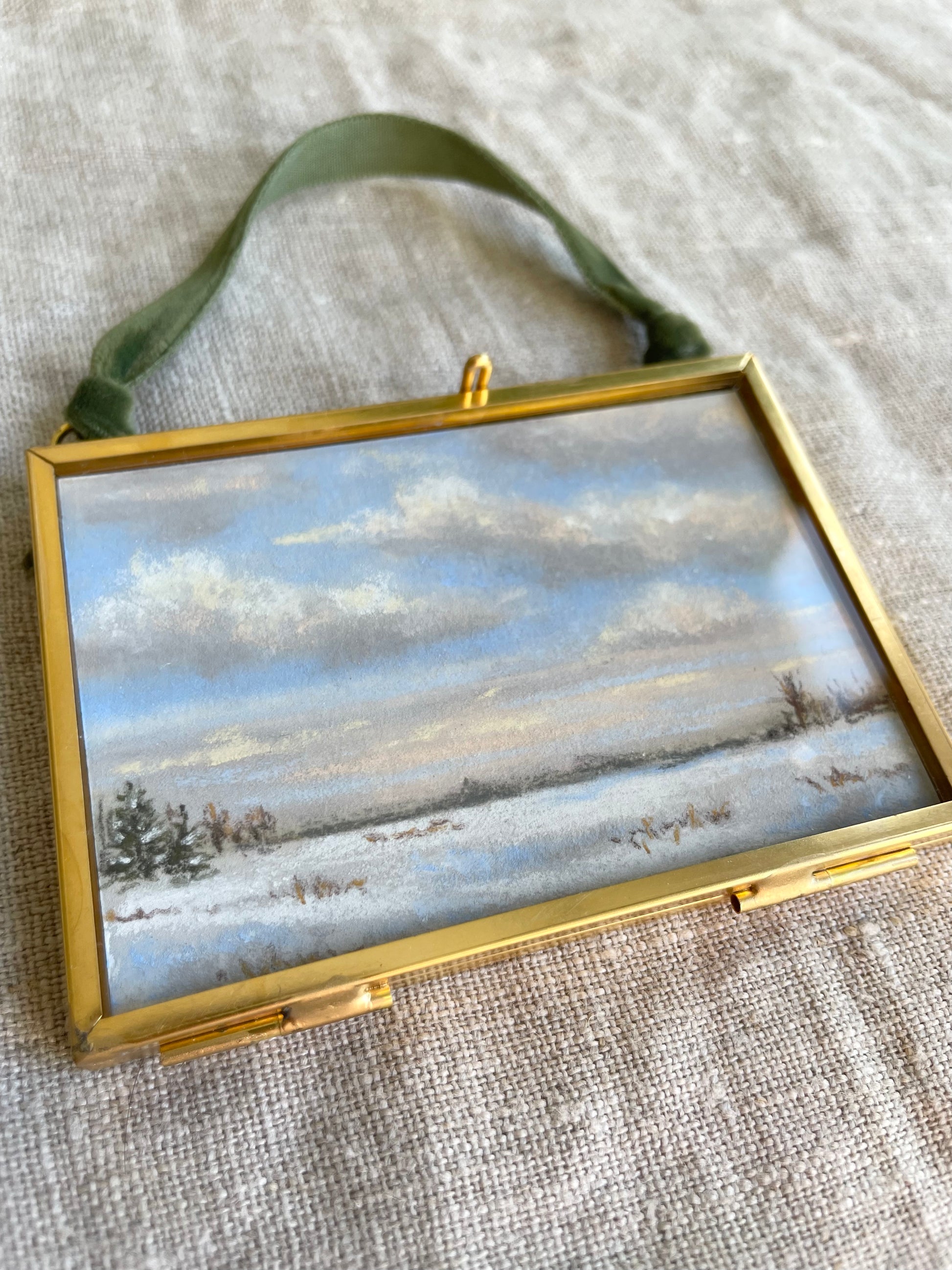 2.5 x 3.5 inches. Hanging brass framed ornament with velvet ribbon for hanging. Signed and titled on reverse. Ornament comes carefully wrapped and tied with ribbon ready for gifting.