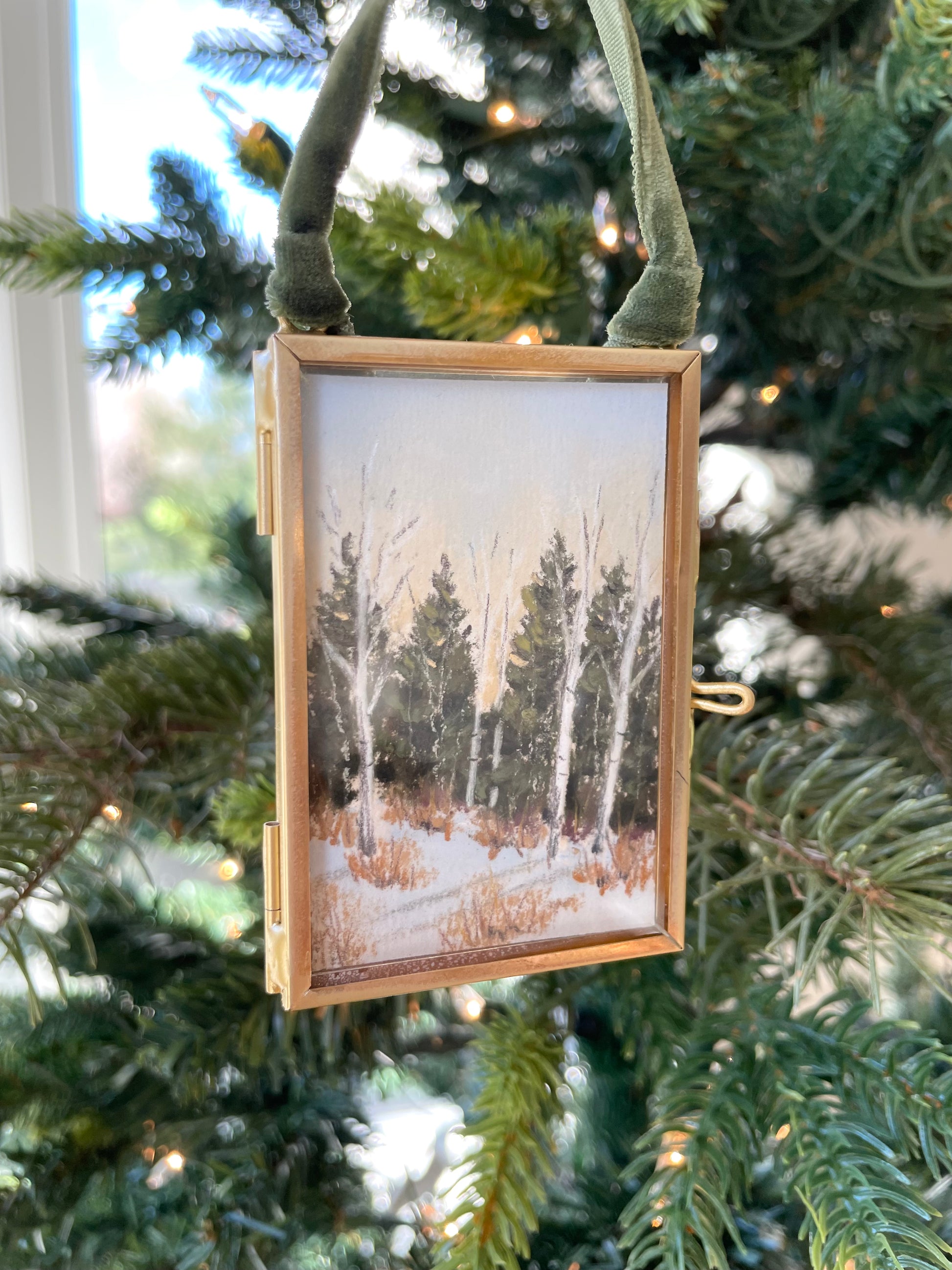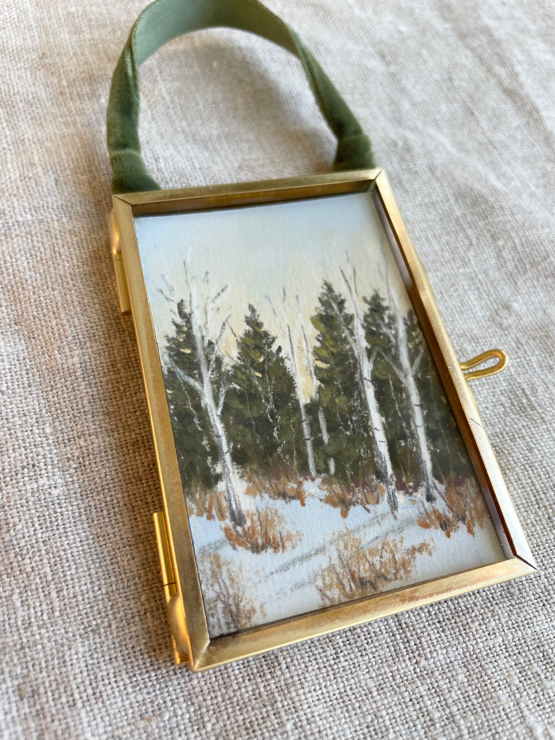 2 x 3 inches. Hanging brass framed ornament with velvet ribbon for hanging. Signed and titled on reverse. Ornament comes carefully wrapped and tied with ribbon ready for gifting.