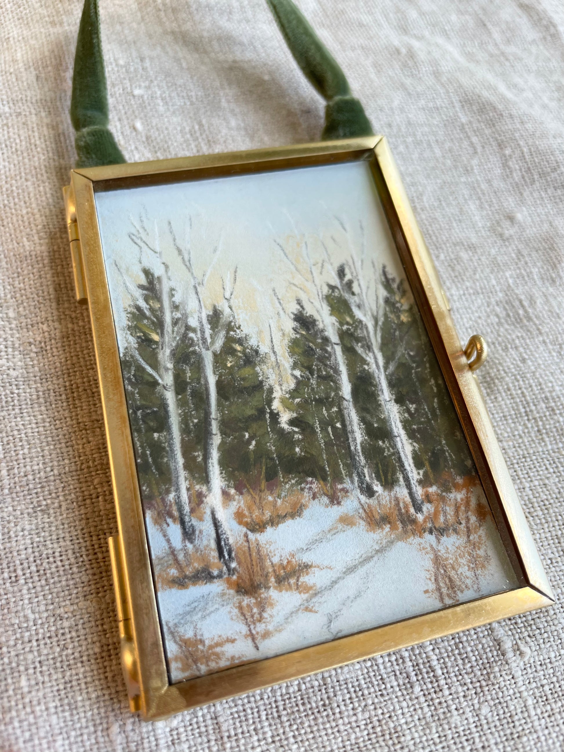 2 x 3 inches. Hanging brass framed ornament with velvet ribbon for hanging. Signed and titled on reverse. Ornament comes carefully wrapped and tied with ribbon ready for gifting.