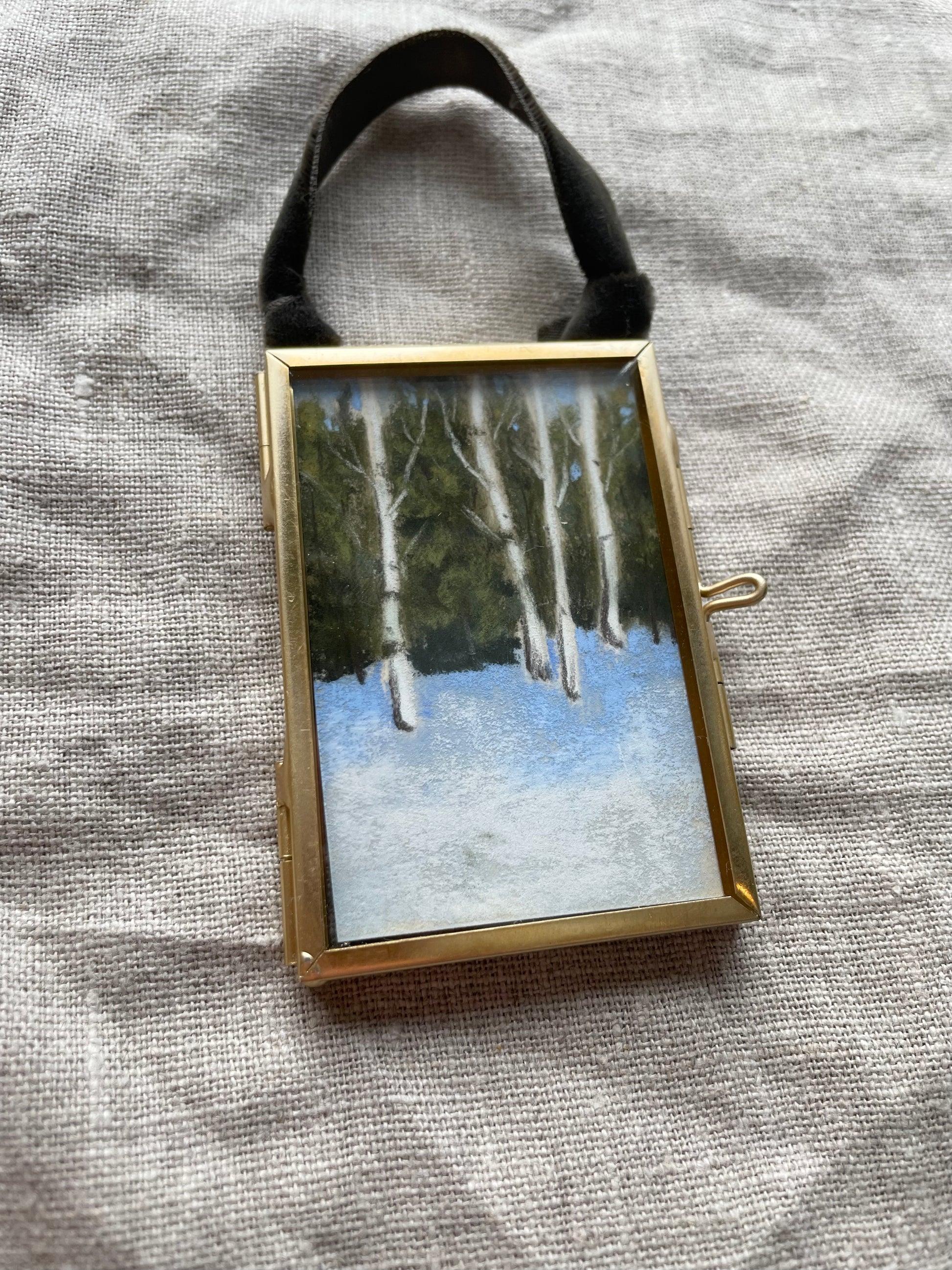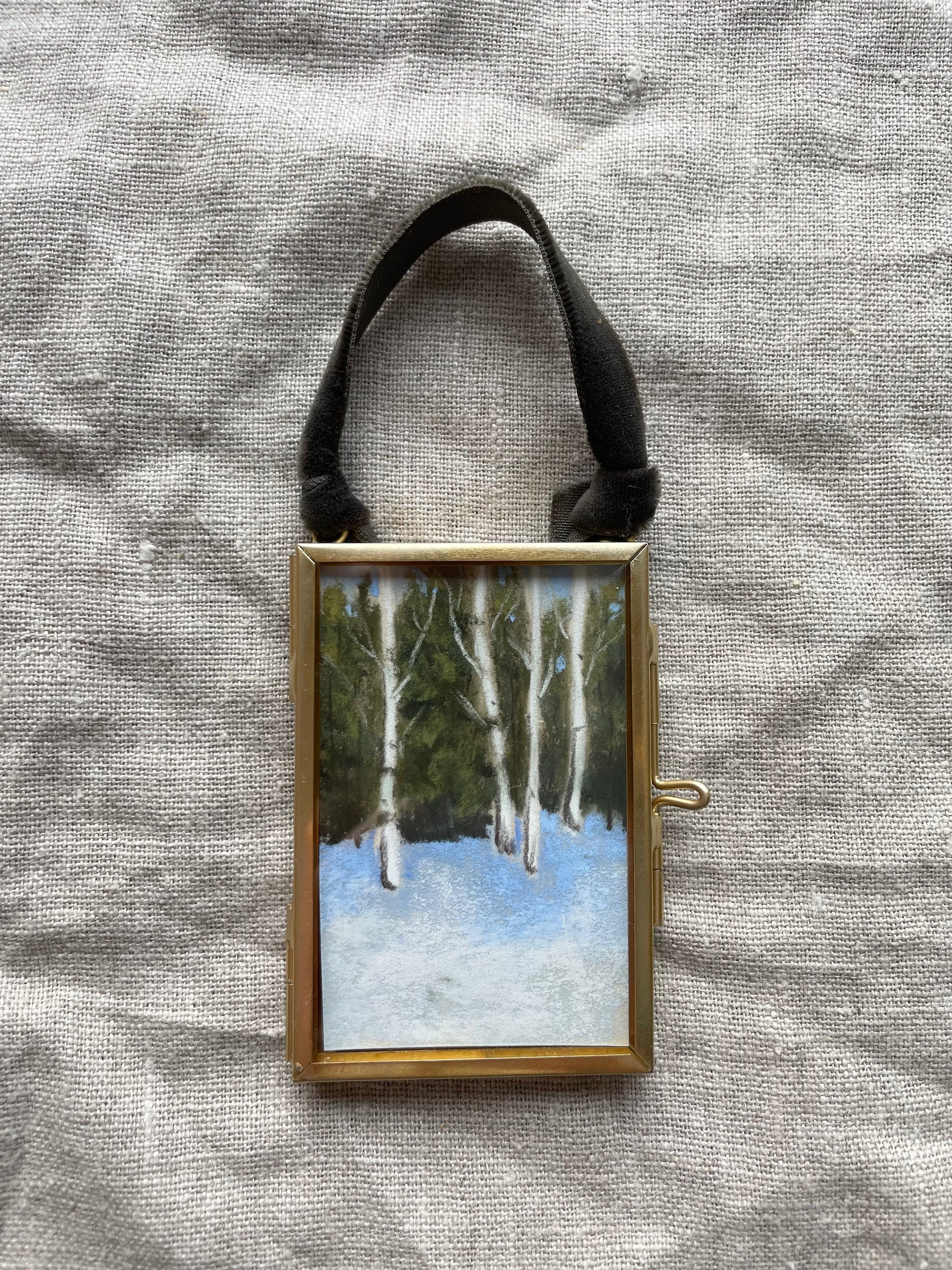 2 x 3 inches. Hanging brass framed ornament with velvet ribbon for hanging. Signed and titled on reverse. Ornament comes carefully wrapped and tied with ribbon ready for gifting.