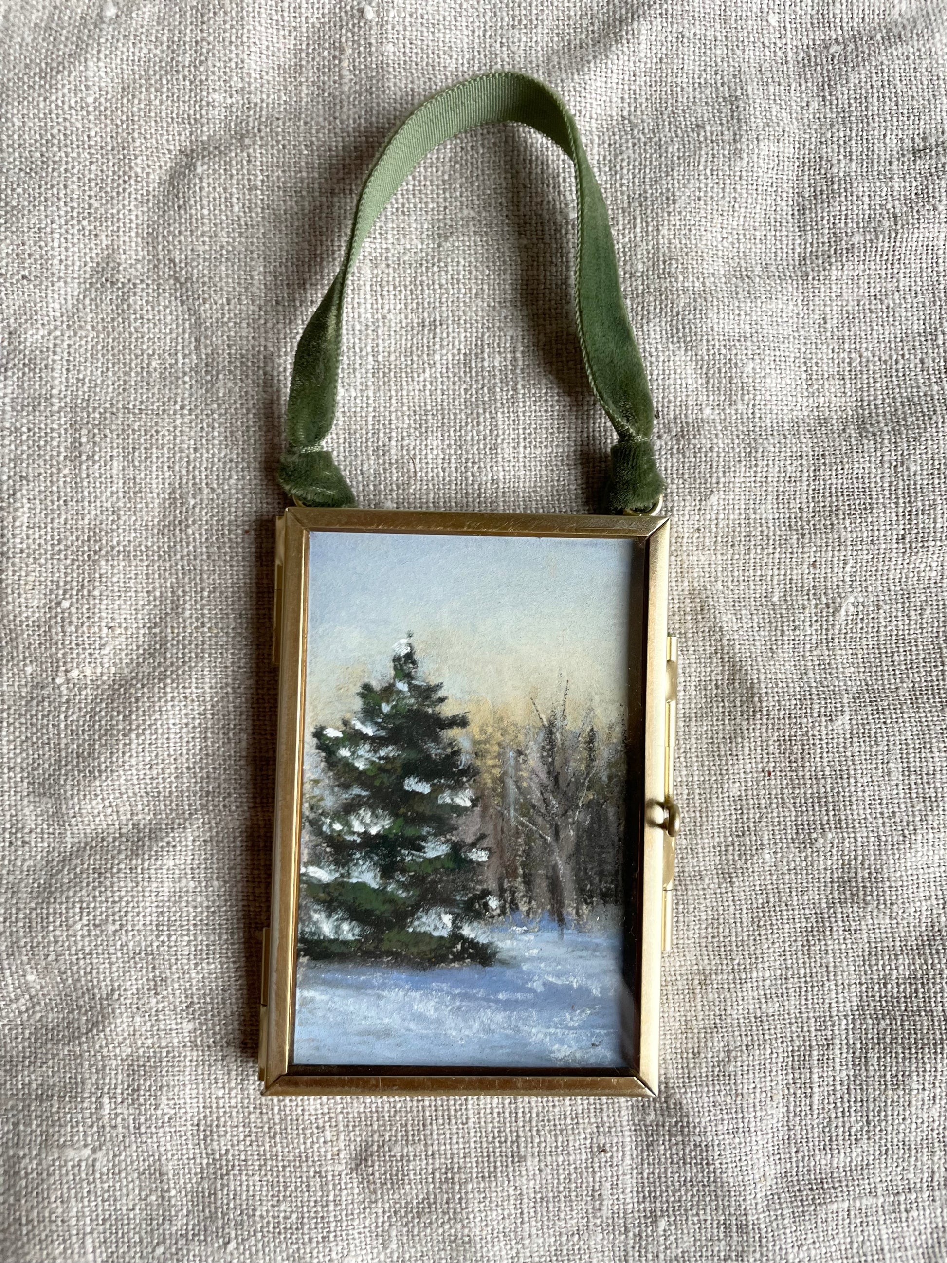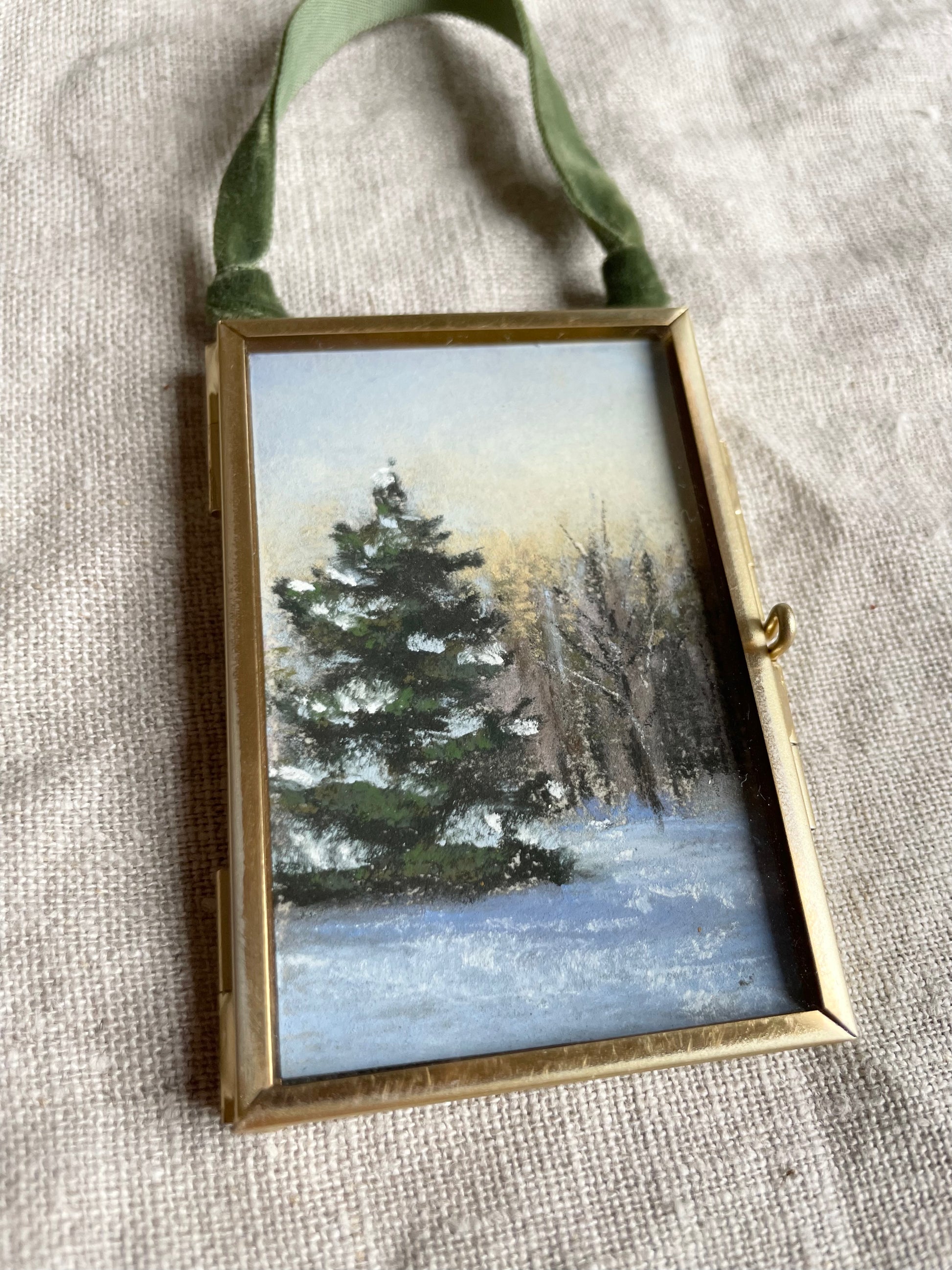 2 x 3 inches. Hanging brass framed ornament with velvet ribbon for hanging. Signed and titled on reverse. Ornament comes carefully wrapped and tied with ribbon ready for gifting.