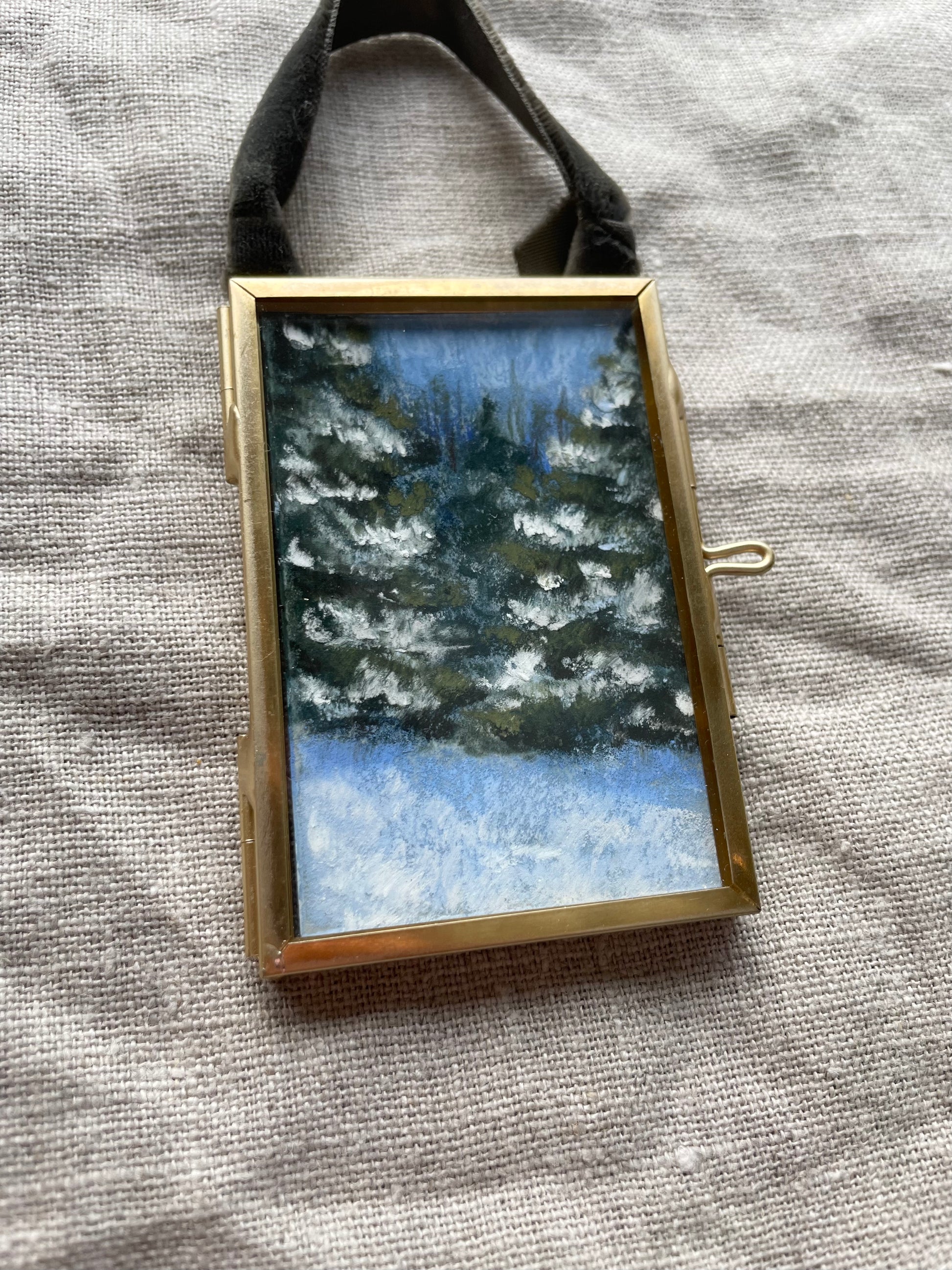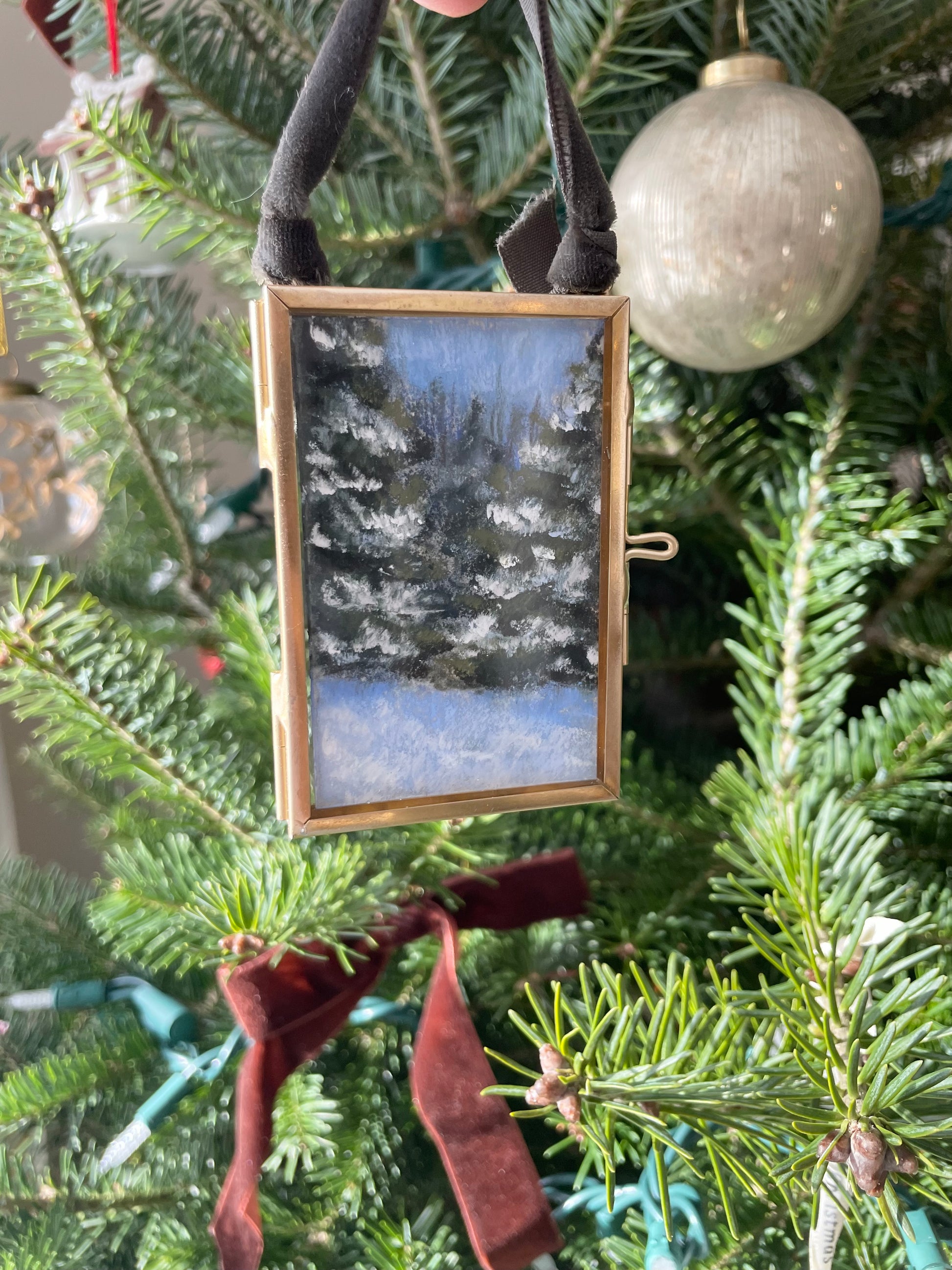 2 x 3 inches. Hanging brass framed ornament with velvet ribbon for hanging. Signed and titled on reverse. Ornament comes carefully wrapped and tied with ribbon ready for gifting.