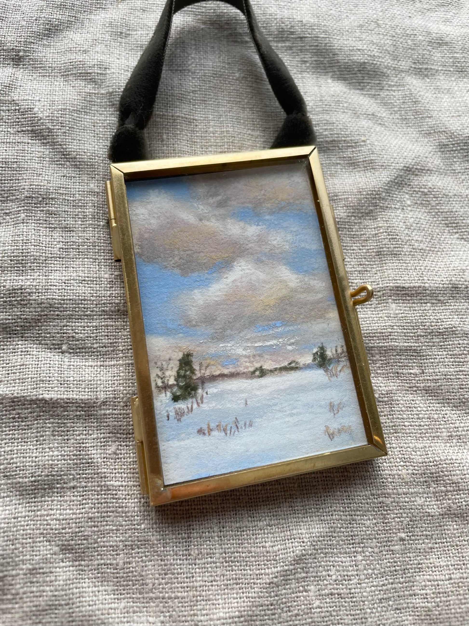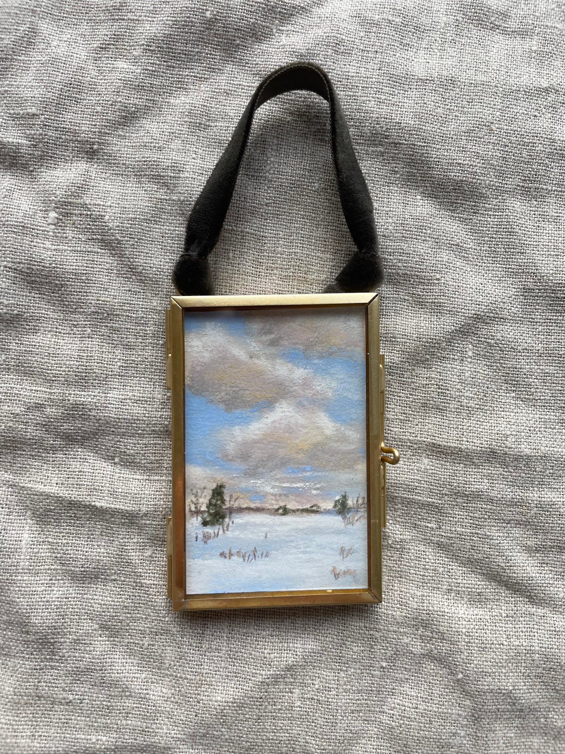 2 x 3 inches. Hanging brass framed ornament with velvet ribbon for hanging. Signed and titled on reverse. Ornament comes carefully wrapped and tied with ribbon ready for gifting.
