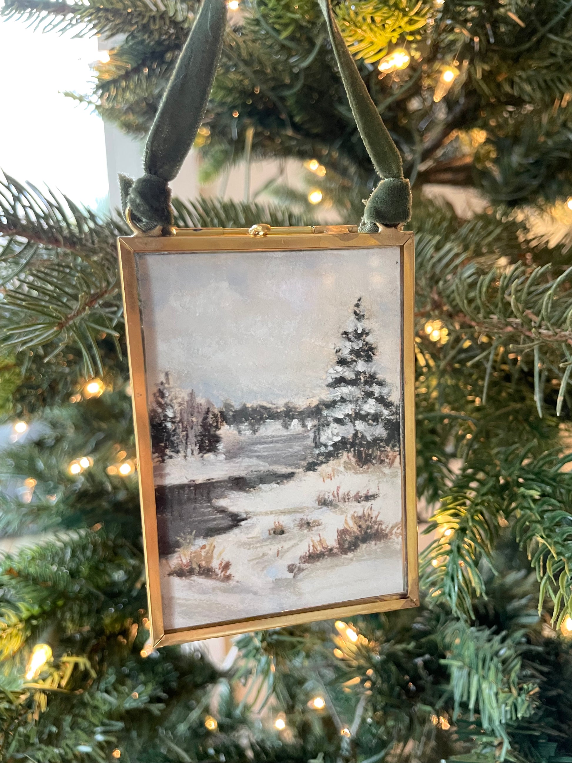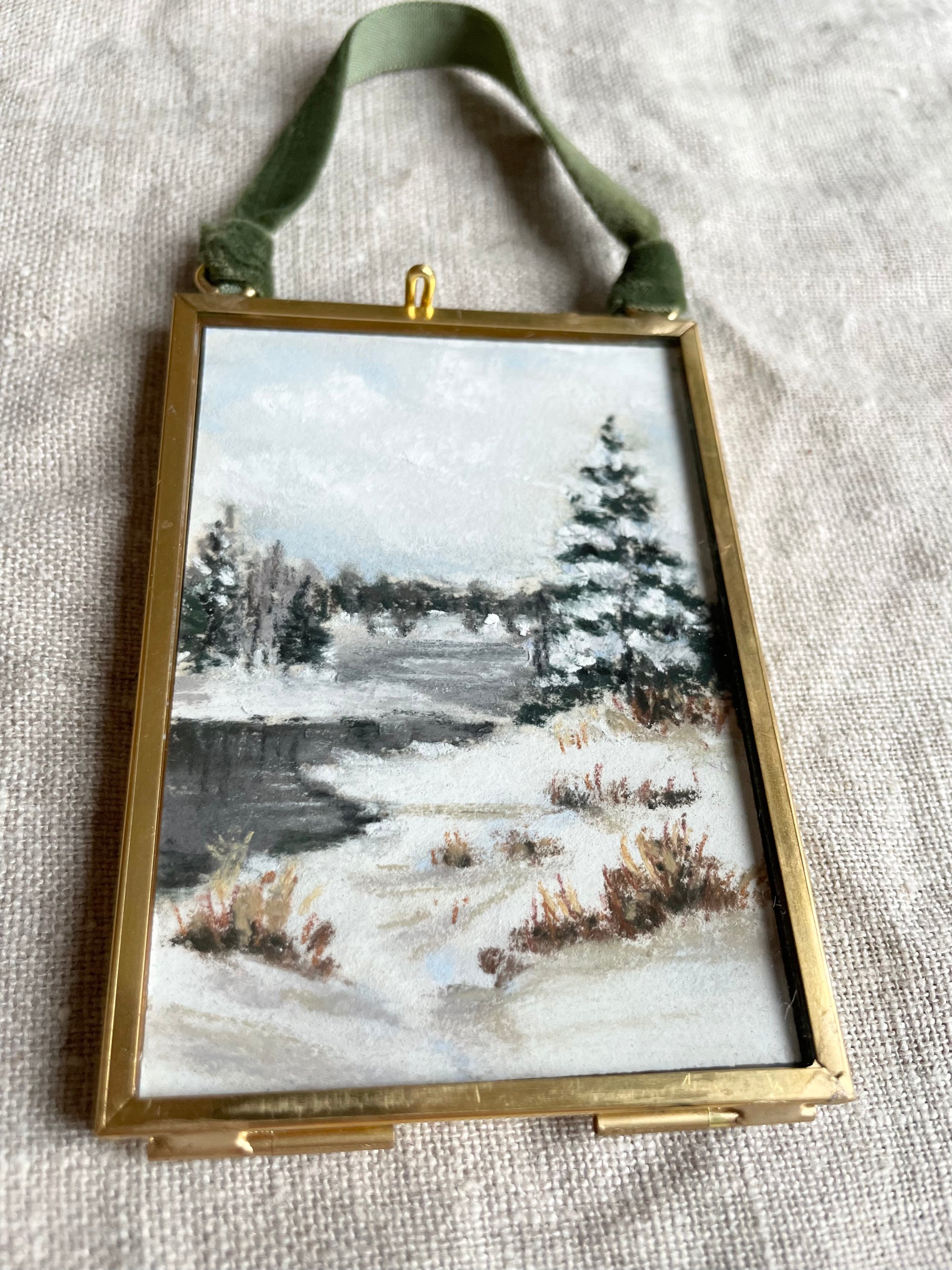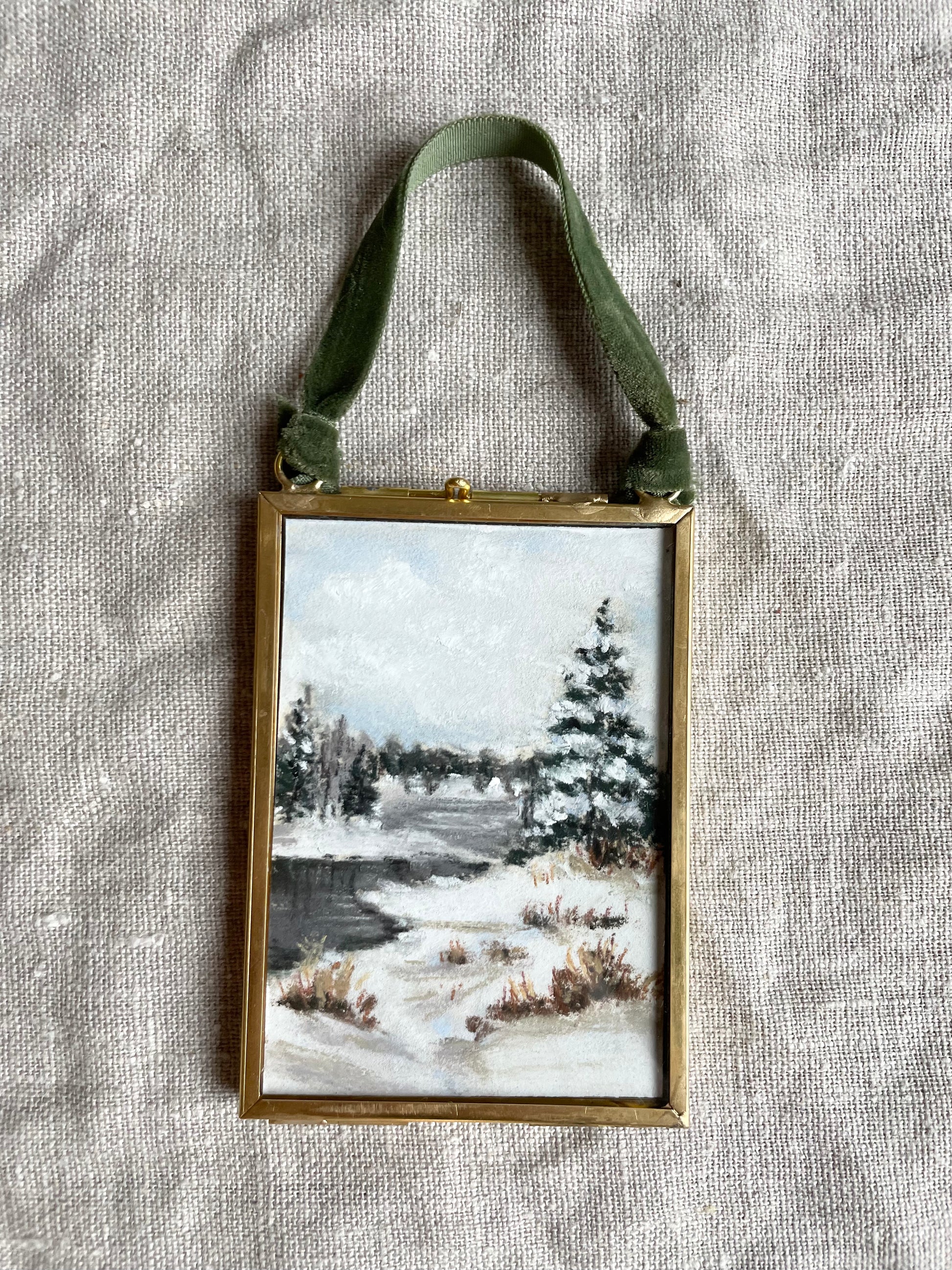 2.5 x 3.5 inches. Hanging brass framed ornament with velvet ribbon for hanging. Signed and titled on reverse. Ornament comes carefully wrapped and tied with ribbon ready for gifting.