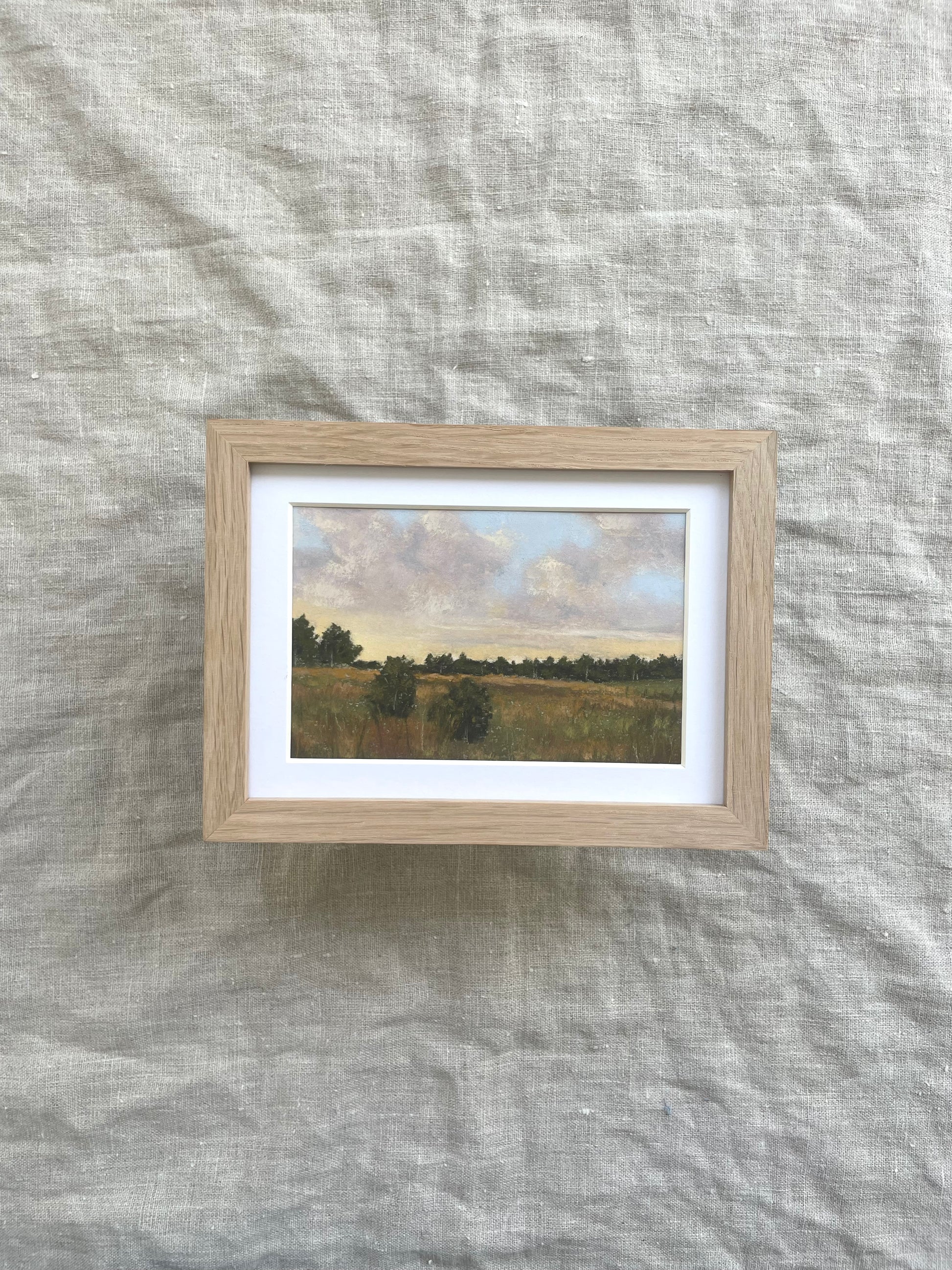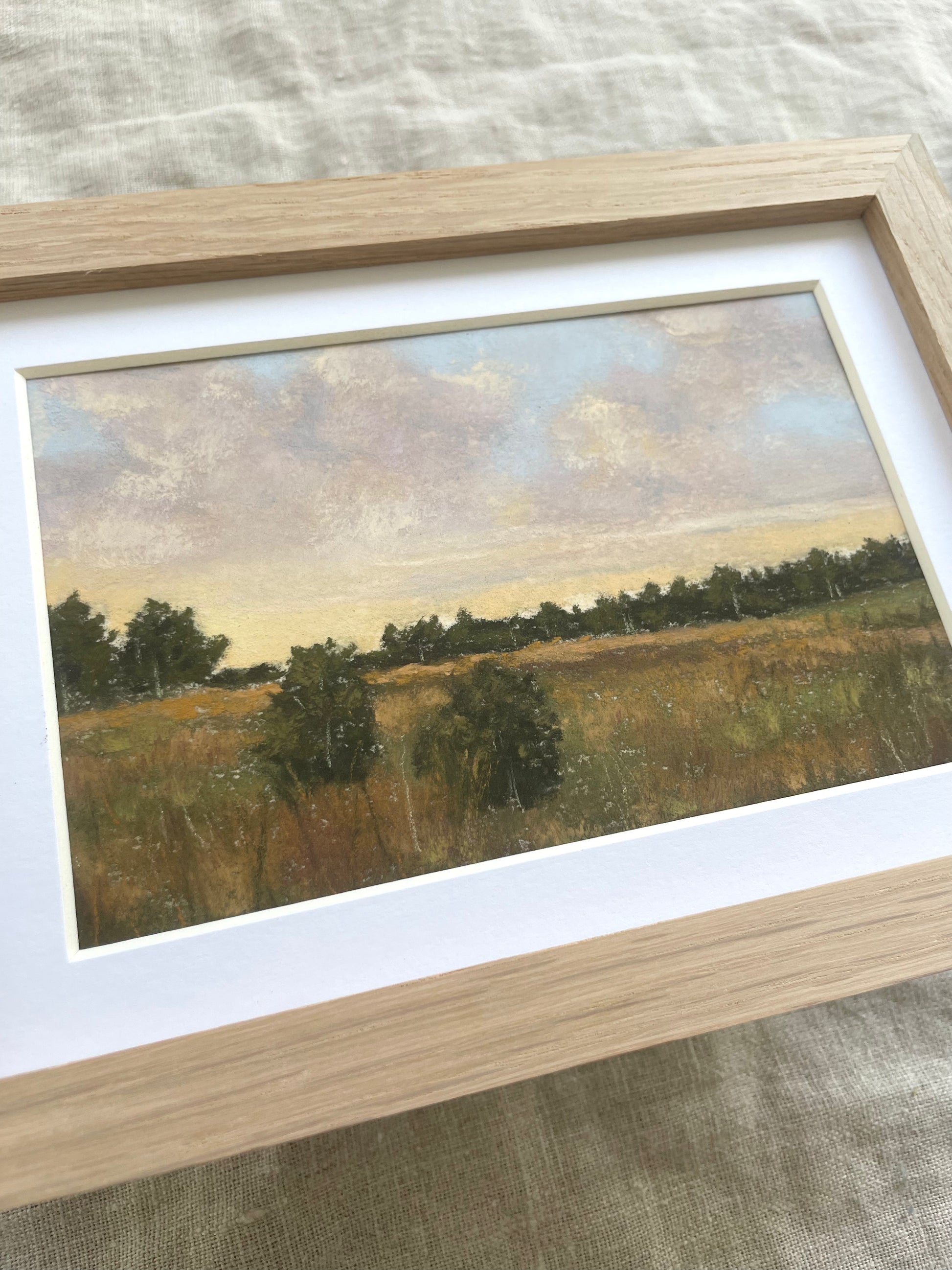 Option to add 5" x 7" solid oak frame as pictured. Pastels need to be handled with care. Paintings are sealed with fixative but are still to be handled with care. It is recommended to frame behind glass.